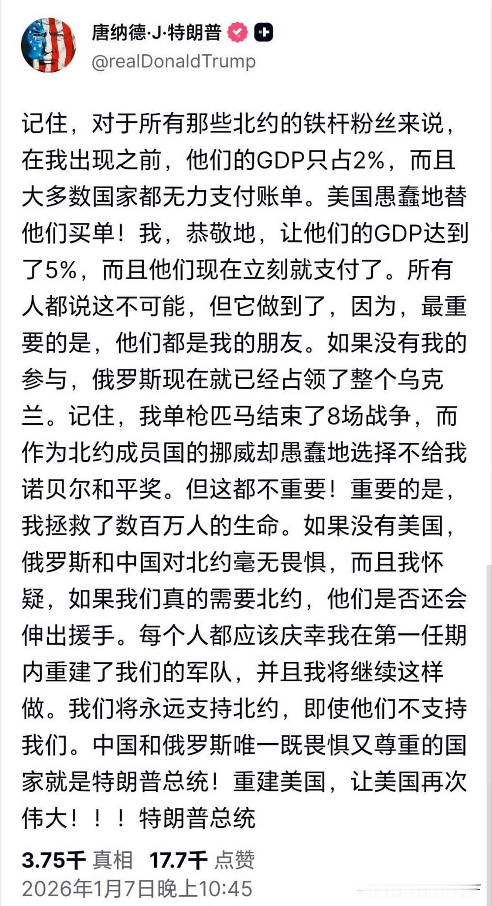 特朗普通告191国:中俄唯一畏惧又尊重,只有“他” 1月7日,因为格陵兰岛问题,特朗普发文嘲讽北约,如果不是自己北约的军费只有GDP的2%。 是自己让军费变成了5%。如果不是他,俄罗斯已经占领了乌克兰,在北约的这个军事总组织里面, 如果没有美国,这个组织对于中俄来说毫无威慑力。是自己一个人结束了八场战争,虽然没有获得诺贝尔奖,但是却拯救了数百万人的生命 中国和俄罗斯唯一尊重的国家,就是在特朗普领导下重建的美国。 怎么说呢?特朗普的这篇发文从头到脚充斥着荒诞自夸。各种自我神话和对他国的无理傲慢。对北约32国各种施压威逼,要求他们将防护费提升至GDP的5%,早就引发了各国的不满。现在更是当着全世界的面。 公然吞噬盟友强占格陵兰岛。在北约集体反对的情况下,他有以退群威逼。刻意宣称“中俄唯一畏惧尊重的是自己”,来讹诈北约32国。一国总统公然当着全世界盟友发出这样傲慢威胁的言论。又一次的将美国的霸权行径公然暴露在全世界面前