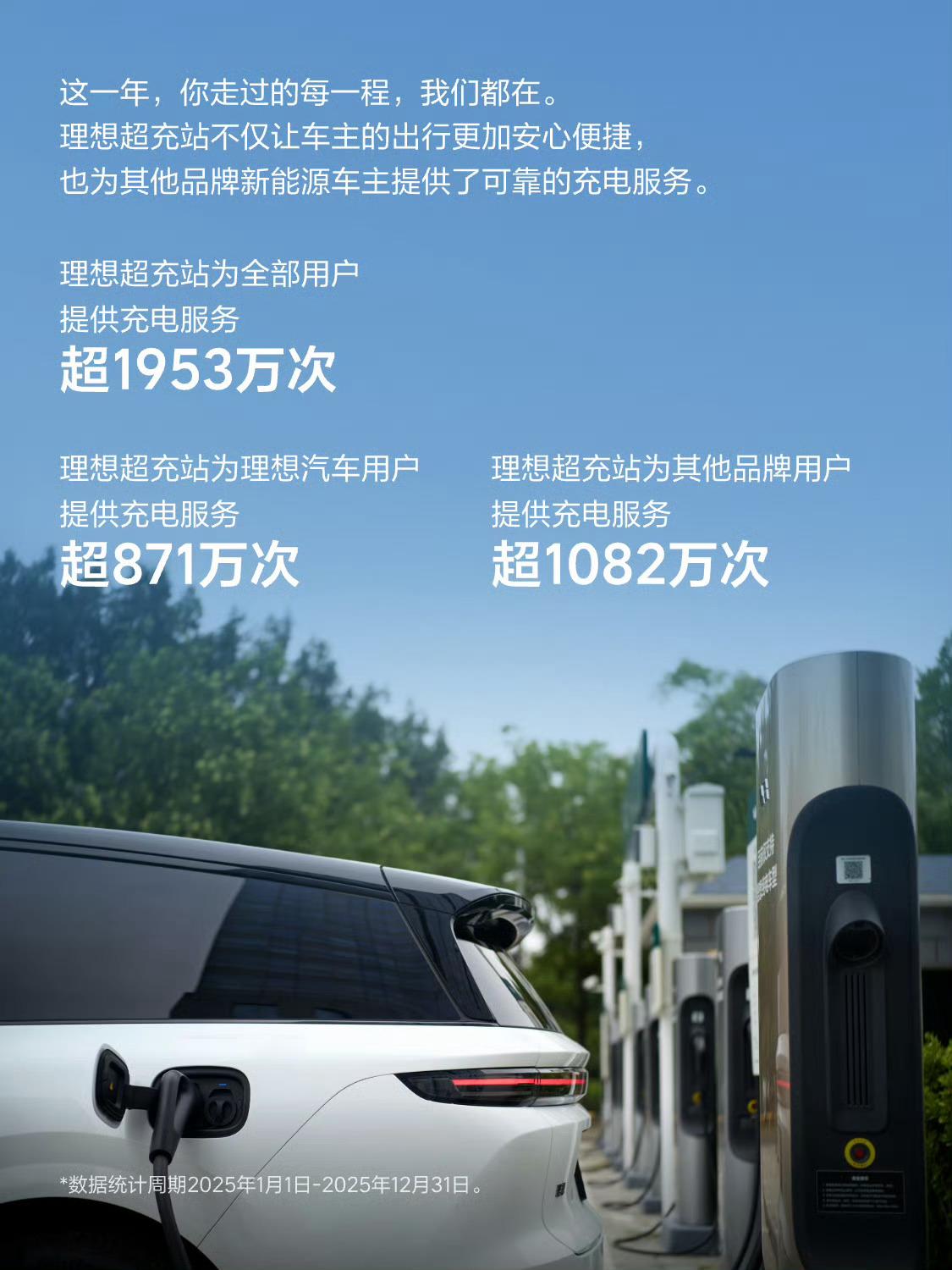 理想超充站2025年理想超充站的铺设速度确实很快,从年初的1700多座,增长到3900多座,提供充电服务1953万次。而5C桩的平均充电时间仅有10.9分钟。今年理想汽车家族也迎来了两台纯电SUV车型。补能服务肯定也会逐渐跟上来。2026年第一周,有140座理想超充站上线,截止到1月4日,理想超充已经布局全国286个城市!