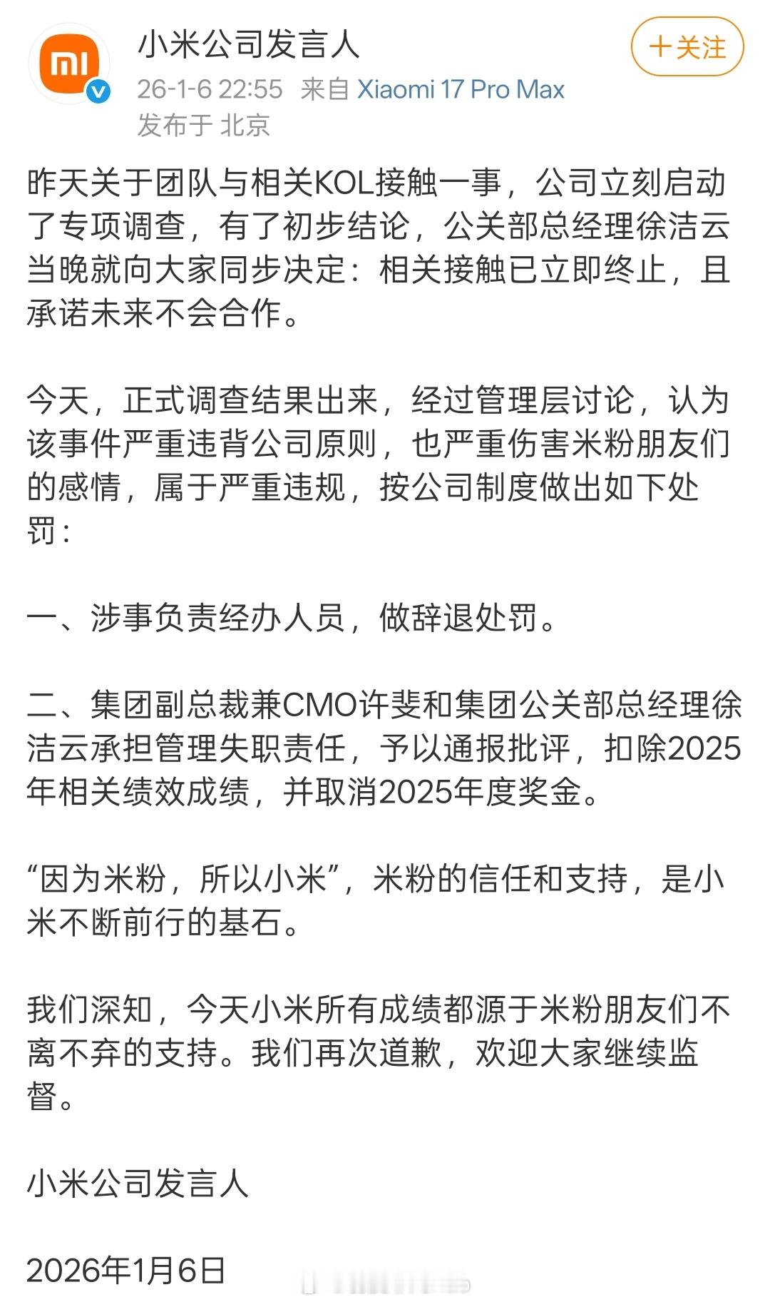 不得不说小米这段时间面对的舆论问题有点多,最初采取的方案好像是打算不做任何回应,这种冷处理的方法确实是一种很不错的公关方法,也比较常见,但它仅适用于那种有可替代性、知名度一般的品牌或个人。像小米这种每天都有人在关注的品牌,这种方法不适用的,毕竟体量和知名度都在这里,除非公关力度有隔壁大厂那么强,把嘴全都堵住才有效果。这次KOL的事情也不是第一次了,只不过这次引起的舆论影响比较大,就像我之前微博说的想,“午后狂睡”的那条微博给小米出了道难题,最终小米选择回应,但回应和不回应都是会引发争议的,所以确实不好处理。小米称此次事件严重伤害米粉感情