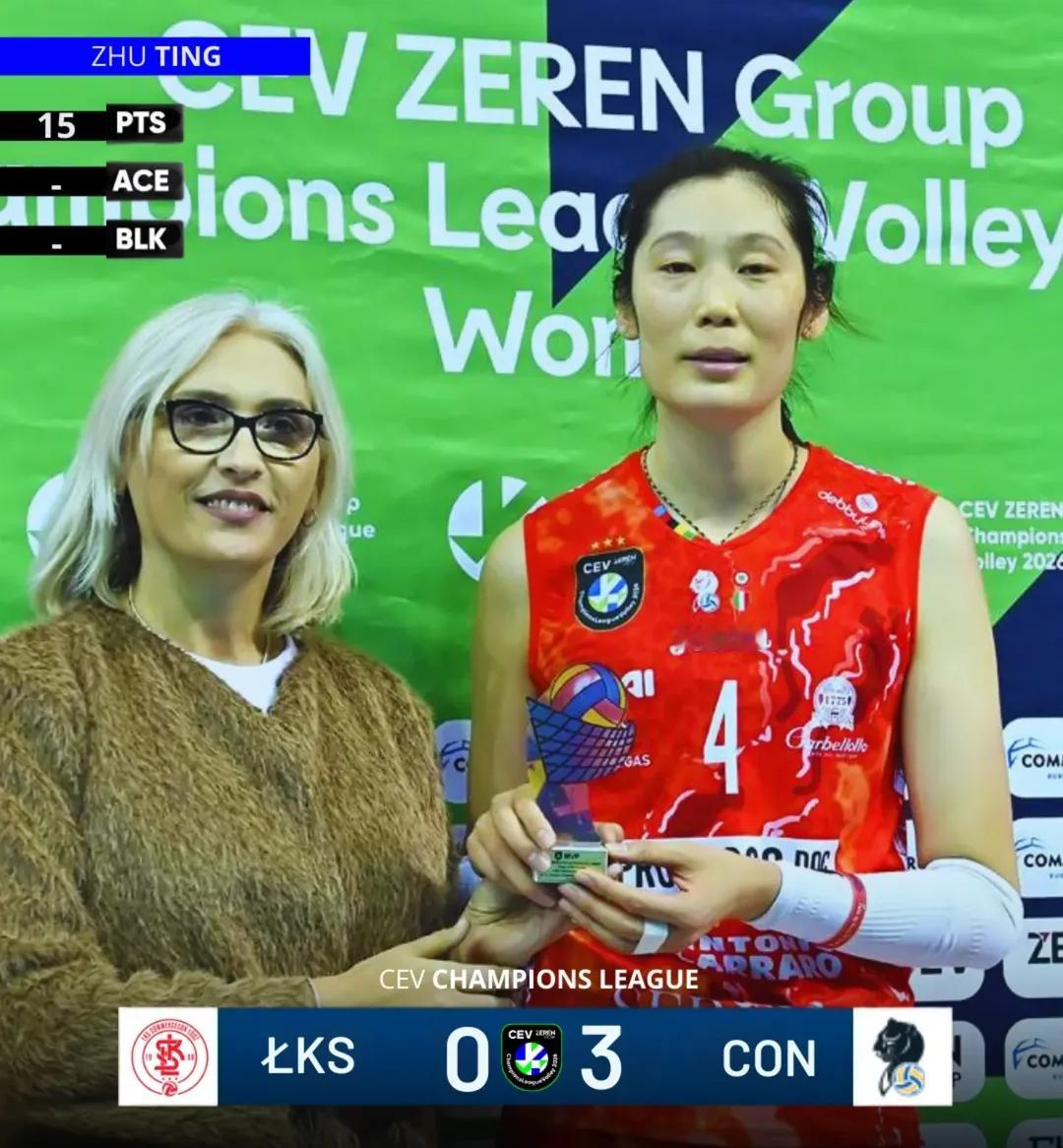 欧冠小组赛,朱婷拿到最高的15分,并当选MVP!朱婷