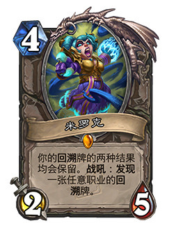 炉石传说 迷你系列“永恒回响”将于1月14日上线。38张新卡,包含4张传说,1张史诗,17张稀有,16张普通。回望了回溯、灌注、黑暗之赐、任务以及双职业牌等各种机制,包括炉石首个双职业任务。灌注:死骑、贼黑暗之赐:牧、骑、猎任务:猎+术回溯:贼双职业:法+战,法+牧,萨+牧、萨+贼、瞎+德,猎+术……等全新组合售价:普通版本:98符文石或2000金币全金色版本:388符文石或10000金币(附赠一张额外的钻石末世的姆诺兹多!)米罗克:中立传说随从,4费2/5你的回溯牌的两种效果均会保留。战吼:发现一张任意职业的回溯牌。无穷之手骑士稀有武器,3费4/2无法攻击英雄。战吼:在本回合中,将本武器的攻击力变为无穷大!猎术双职业传说法术,1费任务:填满你的手牌,然后清空。奖励:提克和托克。提克和托克,5费8/8,龙战吼:抽牌,直到你的手牌上限。亡语:清空对手手牌。盗贼灌注技能,1费回溯。随机获取一张另一职业的随从牌,其法力值消耗减少(1)点。
