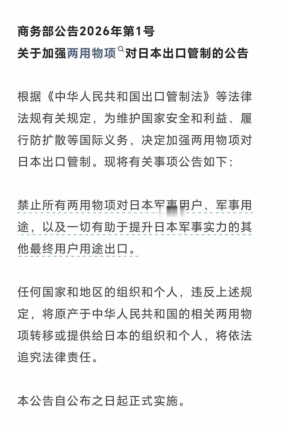 这次对日本的制裁,性质已经非常不一般了。 ​我的直观感受只有一句话: 中方已经在心理和政策层面,做好了对日经济半脱钩(即降低关键领域经贸依存度)的最坏准备。 2026年1月6日,商务部的公告一出来,就打破了所有人对“常规反击”的想象。公告明确禁止所有两用物项向日本军事用户、军事用途出口,哪怕是能间接提升日军事实力的用途也被全面叫停,违反规定还会被依法追责。这可不是简单的贸易限制,800多项涵盖半导体、精密机械、稀土等的物项被纳入管制,直接瞄准了日本产业的命门。 谁都清楚,这一切的导火索,是日本首相高市早苗的涉台错误言论。她不仅公然暗示要武力介入台海,还计划放宽杀伤性武器出口、增加防卫费,完全触碰了中国的核心利益红线。中方不是没给过机会,去年12月就多次严正警告,可日方置若罔闻,甚至在制裁出台后,还让外务省官员跳出来“叫屈”,说中方措施“不符合国际惯例”。这种一边挑衅一边装受害者的操作,彻底消耗了中方的耐心。 更关键的是,这次制裁早有铺垫,绝非临时起意。2025年12月,针对公然勾结“台独”的日本自卫队前高官岩崎茂,中方已经启动反制,冻结资产、禁止入境,用实际行动划出红线。而在此之前,削减赴日航班、暂停进口日本海产品、提醒公民谨慎赴日留学等措施,已经逐步降低了双方经贸的“绑定度”。这一系列操作,更像是一套精准的“减压程序”,为可能到来的半脱钩铺路。 日本的经济软肋,其实一直攥在中方手里。据公开行业报告,野村综合研究所早就算出,用于电动汽车电机的镝、铽等重稀土,日本几乎100%依赖中国供应。即便整体稀土进口对华依存度降到60%,可关键品类的断供,依然能让日本相关产业停摆——限制3个月损失6600亿日元,持续一年更会拖累GDP下降0.43%。更别说这次管制的两用物项,涉及规模达10.7万亿日元,据公开行业报告,占日本自华进口总额的42%,一旦严格执行,日本产业根本扛不住。 中方敢做这样的决定,底气来自多年的产业布局。曾经,中日贸易中“日本供核心元件、中国加工出口”的链条很稳固,但现在不同了。中国早已是全球唯一拥有全工业门类的国家,稀土永磁、氧化锆等产业形成全产业链优势,即便对日出口受限,也能通过欧美等市场消化产能。2024年以来,中方对镓、锗等关键资源的出口管制,已经倒逼国内企业升级,甚至吸引了全球产业链向中国转移,这正是半脱钩准备的最好证明。 有人会问,这么做会不会两败俱伤?客观说,影响肯定有,但中日贸易的依存度本就不对称。日本对华出口占其出口总额的近两成,而中国对日贸易在总外贸中的占比早已降到个位数。日本旅游业更依赖中国游客,中国游客消费占比达三成,一旦赴日提醒持续,每年将给日本造成1.79万亿日元损失。反观中国,国际组织纷纷上调2026年经济增长预期,国内市场和多元贸易伙伴足以对冲影响。 你身边有没有感受到中日经贸往来的变化?你觉得这种精准制裁能让日方认清现实吗? 国家利益面前,没有妥协的余地。中方的准备,不是要主动挑起冲突,而是对日方不断突破底线的必要回应。日本若继续抱着“挑衅无代价”的幻想,只会把自己的经济逼入绝境。两岸问题是中国内政,任何外部势力都无权干涉,这是不可撼动的底线。 各位读者你们怎么看?欢迎在评论区讨论。