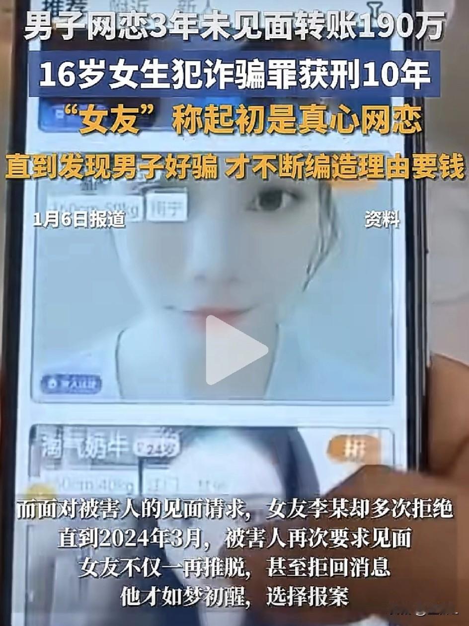 16岁女孩装“富家千金”,网恋3年骗走190万!最后判10年罚12万,网友:这演技不进军娱乐圈可惜了! 2026年1月7日,上海浦东法院的一纸判决,揭开了一场持续三年的“豪门恋爱”骗局——而主演,竟是个00后小姑娘。 事情要从2021年说起。那年10月,一位Y先生在交友软件上邂逅了一位“白富美”。对方照片精致,谈吐优雅,自称家境优渥,妥妥的“人间富贵花”。 Y先生心动了,两人很快确立恋爱关系。 没想到,这场“甜蜜恋爱”的剧本,从一开始就是编的。 “妈住院了” “要买机票” “手头紧”…… 恋爱没谈几天,“富家女友”就开始花样要钱。Y先生也是实诚,从2021年10月到2024年3月,陆陆续续转了190多万过去! 这钱都去哪儿了?全被小姑娘拿去吃喝玩乐、买买买了。 更让人大跌眼镜的是:这姑娘行骗时,才16岁! 也就是说,她一边上着学,一边编着“豪门千金的日常”,把一位成年男性耍得团团转。 而且,190万里有170多万,都是在她成年之后骗到手的——这“业务能力”,简直“天赋异禀”。 时间久了,Y先生也想见见真人。可每次一提见面,对方总有各种理由推脱。 拖了快三年,Y先生终于觉出不对劲,2024年3月报了警。同年6月,这位“戏精女友”李某落网。 到案后,李某退回了60万元,也拿到了Y先生的部分谅解。但法律不是儿戏,法院审理认为,她诈骗数额特别巨大,虽部分退赃,仍应严惩。 最终,2026年1月7日,浦东法院作出判决:李某犯诈骗罪,判处有期徒刑十年,并处罚金十二万元。 一场持续三年的“虚拟豪门恋”,换来的是实实在在的十年铁窗。 网友辣评: “16岁就有这‘演技’和‘心理素质’,可惜用错了地方。” “190万!我做梦都不敢梦这么多钱,她靠聊天就拿到了?” “提醒各位:网恋千万条,核实第一条。转账不规范,亲人两行泪。” “这故事告诉我们:手机对面叫你‘宝贝’的,可能是个未成年‘戏精’。” 网络世界虚虚实实,各位在追求缘分时,也别忘了捂紧钱包。毕竟,真正的爱情,从来不需要你不断“充值”才能续费。 素材来源:深圳新闻网,侵联删!