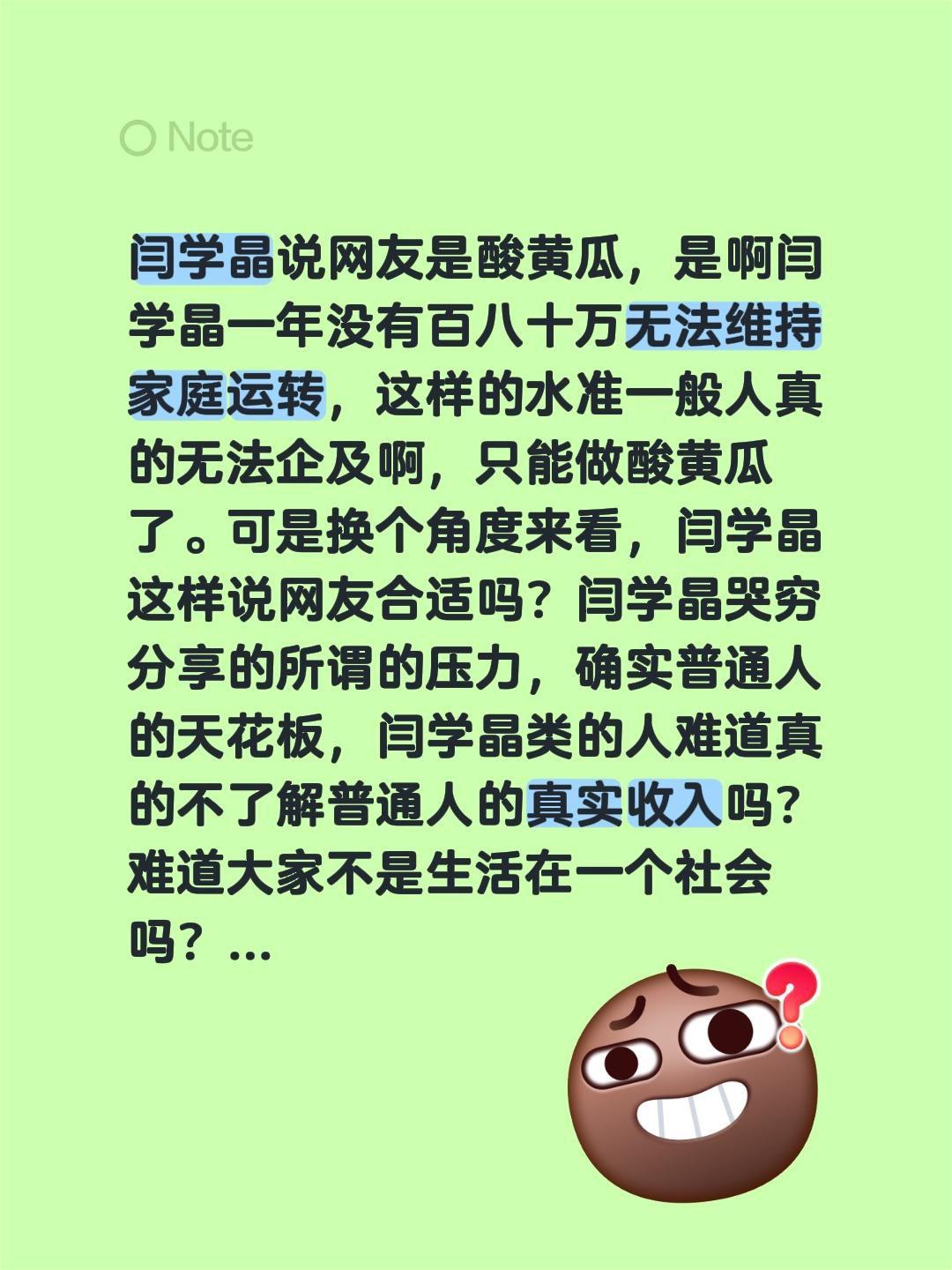 闫学晶说网友是酸黄瓜,是啊闫学晶一年没有百八十万无法维持家庭运转,这样的水准一般人真的无法企及啊,只能做酸黄瓜了。可是换个角度来看,闫学晶这样说网友合适吗?闫学晶哭穷分享的所谓的压力,确实普通人的天花板,闫学晶类的人难道真的不了解普通人的真实收入吗?难道大家不是生活在一个社会吗?闫学晶的酸黄瓜骂醒了大家,让大家看清酸黄瓜背后的真实闫学晶!