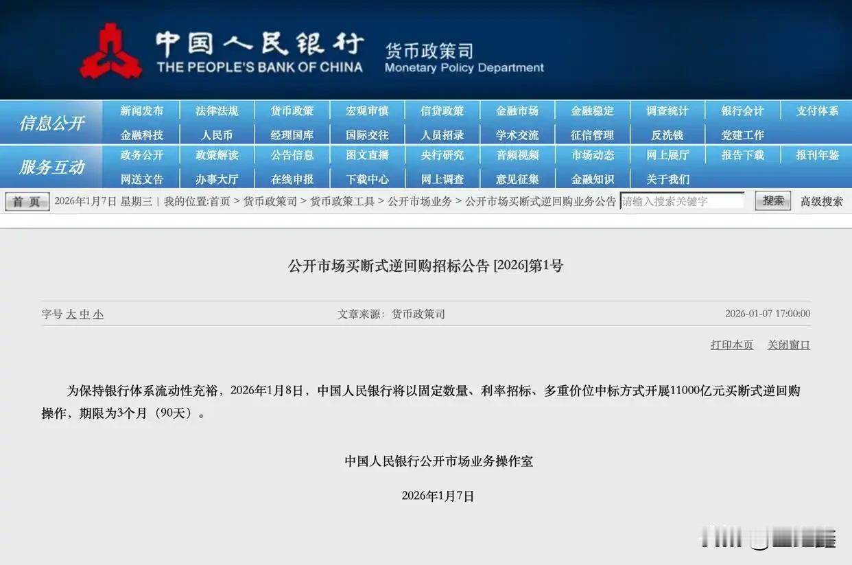 重磅!央行开年放大招:1.1万亿巨资空降!你的房贷、理财、股市,都要变? 2026年才开年,央行就扔出“王炸”!1月8日,中国人民银行官宣:开展11000亿元买断式逆回购操作! 很多朋友一听“1.1万亿”,第一反应是:又要大水漫灌了?房价要涨? 千万别误读! 这笔钱不是凭空印出来的,而是央行给银行的“定期存款”,期限3个月。它最大的作用是精准填坑——刚好对冲了当天到期的1.1万亿资金,属于“无缝衔接”。 但这笔钱和你息息相关! 银行“手头宽裕”了,市场利率就能稳住。这意味着:你的房贷利率大概率不会反弹; 理财收益(特别是货币基金)有望止跌回升;股市的流动性也会更充裕,是个妥妥的“暖心”信号! 这波操作,你怎么看?欢迎在评论区留言,和我一起聊聊!