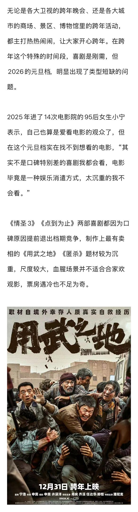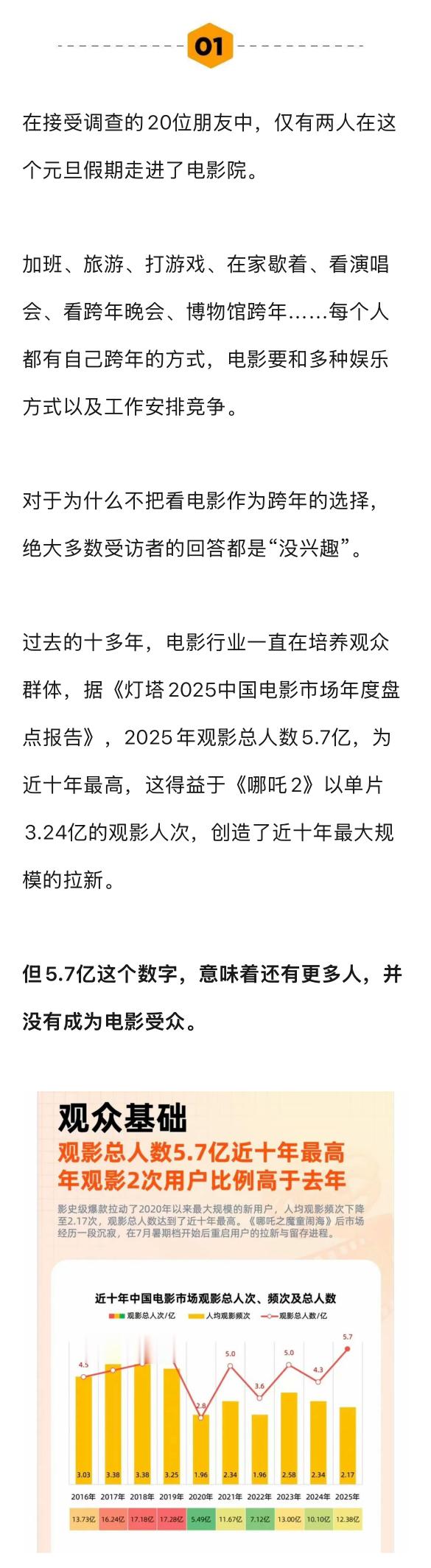 观众为什么不进电影院了大IP对非影迷类受众更有吸引力 元旦档后,新浪娱乐工作室和身边分布在各行各业、年龄从85后到05后的约20个朋友聊了聊,听听普通观众不爱进电影院的原因。在接受调查的20位朋友中,仅有两人在这个元旦假期走进了电影院。对于为什么不把看电影作为跨年的选择,绝大多数受访者的回答都是“没兴趣”。在跨年这个特殊的时间段,喜剧是刚需,但2026的元旦档,明显出现了类型短缺的问题。2025年进了14次电影院的95后女生小宁表示,自己也算是爱看电影的观众了,但在这个元旦档实在找不到想看的电影,“其实不是口碑特别差的喜剧我都会看,电影毕竟是一种娱乐消遣方式,太沉重的我不会看。”春节档也是凭借大片云集,并且在合家欢、轻松有趣、鼓舞人心的方向上努力了许久,才培养起观众的观影意识,让大家相信走进电影院可以感受到节日氛围,是庆祝佳节的一种选择。很可惜,今年的元旦档在《年会不能停!》《“骗骗”喜欢你》之后,未能趁胜追击强化档期概念。今年因为缺乏跨年气质的电影内容,影院也是巧妇难为无米之炊,难以营造出跨年的仪式感。但另一方面,仪式感也需要更新迭代了,观众显然不好糊弄了。如何找到新颖好玩、又简单易操作的办法,增加电影院观影的社交性、可玩性,从而提升影院跨年的节日氛围和仪式感,是这个档期留下的新问题….娱理独家↓