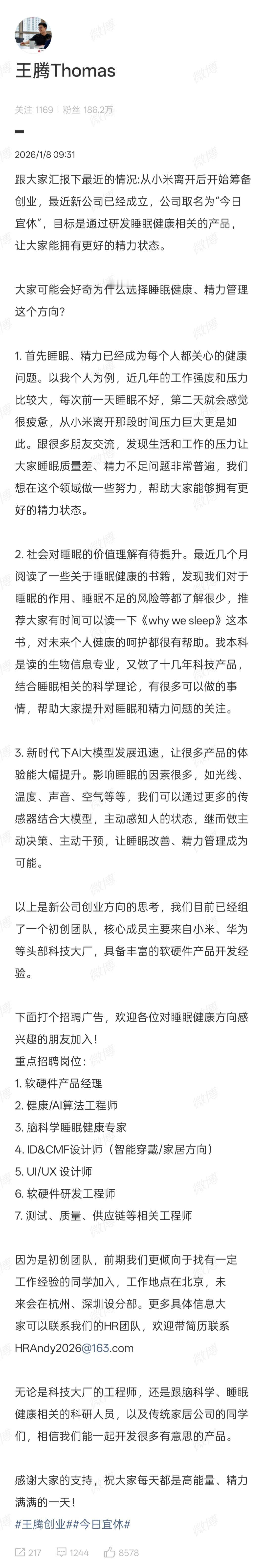震惊,王腾成立睡觉公司[吐舌] 前小米高管王腾发文称离开小米后筹备创业,新公司“今日宜休”已成立。其目标研发睡眠健康产品助大家提升精力。初创团队核心成员来自小米、华为等,未来将在杭深设分部。产品会接入米家生态,暂无做保健品计划。