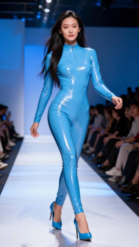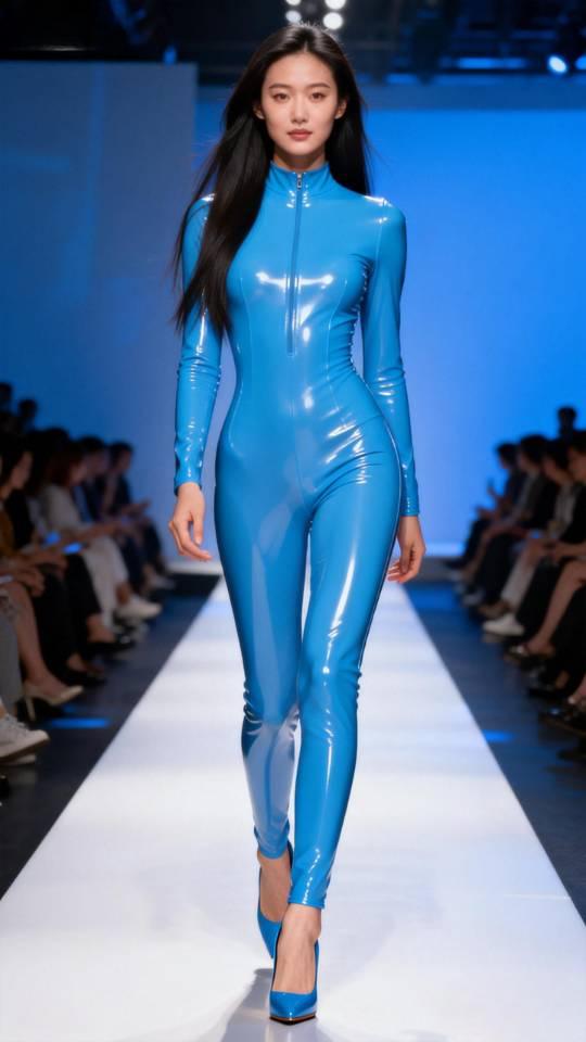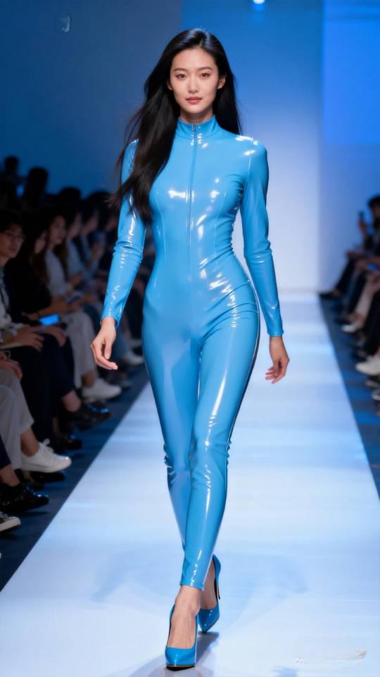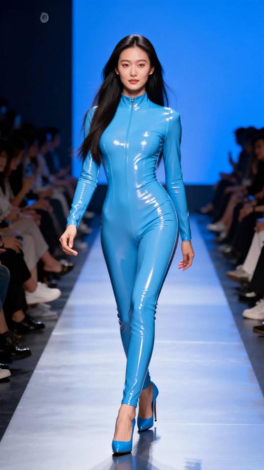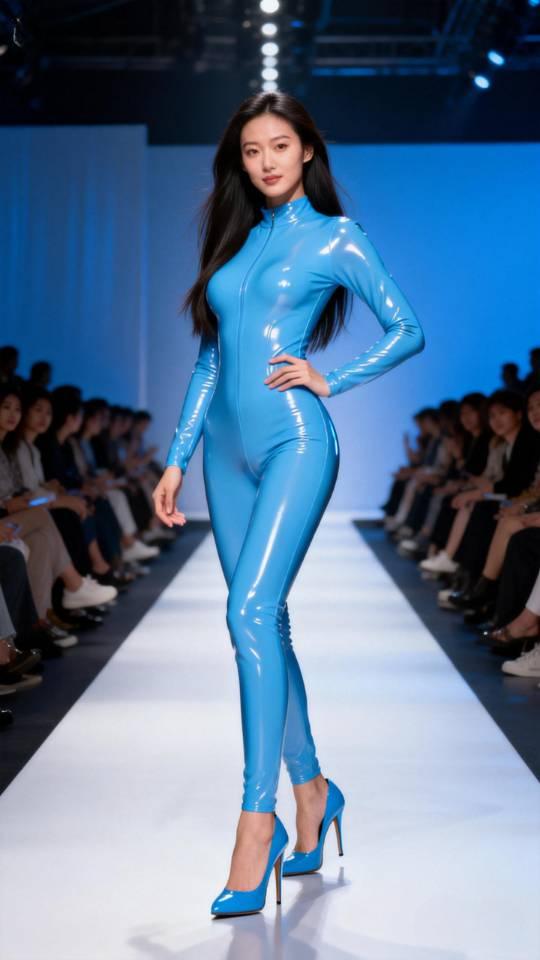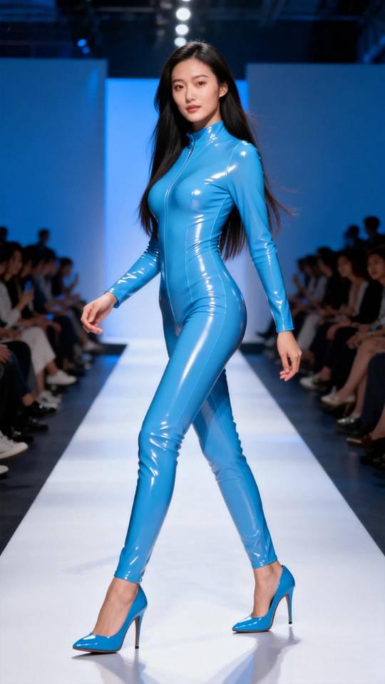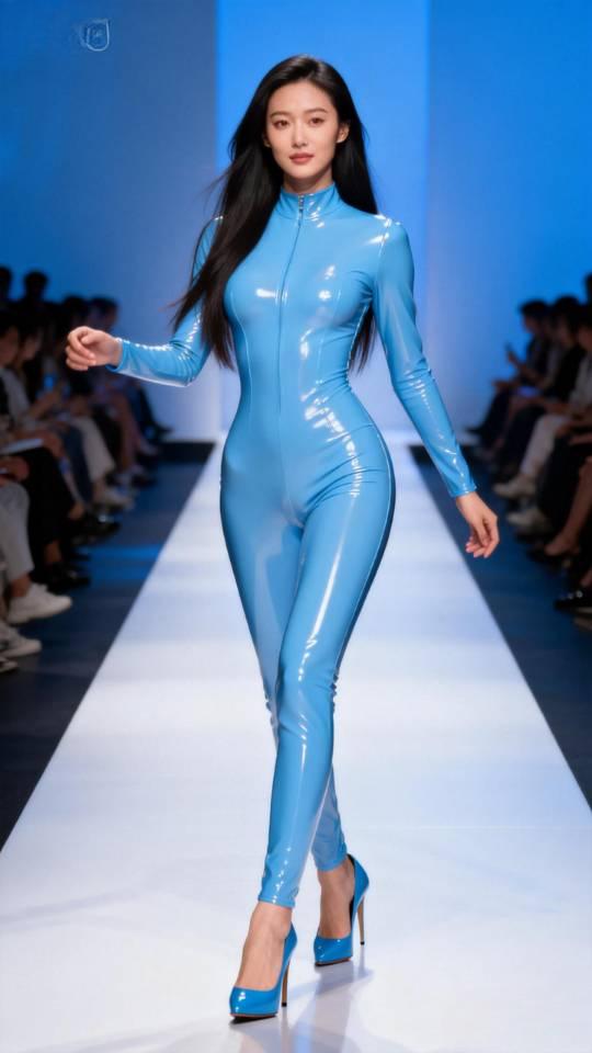 身穿蓝色连体衣的女模特T台走秀。美女壁纸 T台秀