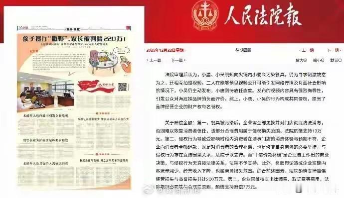 人民法院报第三版刊登海底捞尿火锅 事件判决结果。 一泡尿判决生效,家长登报道歉。 当事人称会改过自新,父母致歉,认罚220万。 一则事件,教育全网人,子不教父之过!