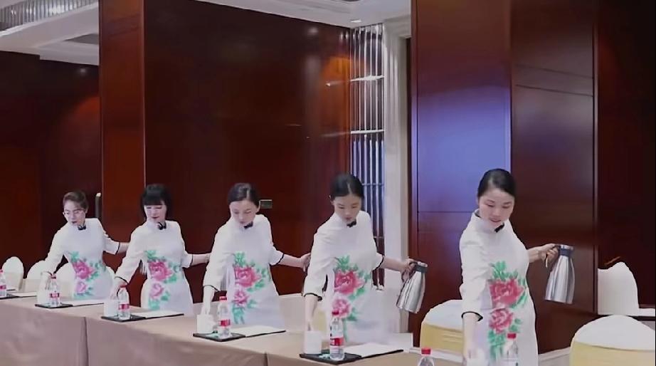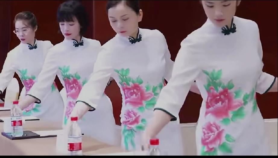 统一穿着白色的旗袍,旗袍上还绣着国花牡丹,都是年轻漂亮的面孔,看起来着实赏心悦目。