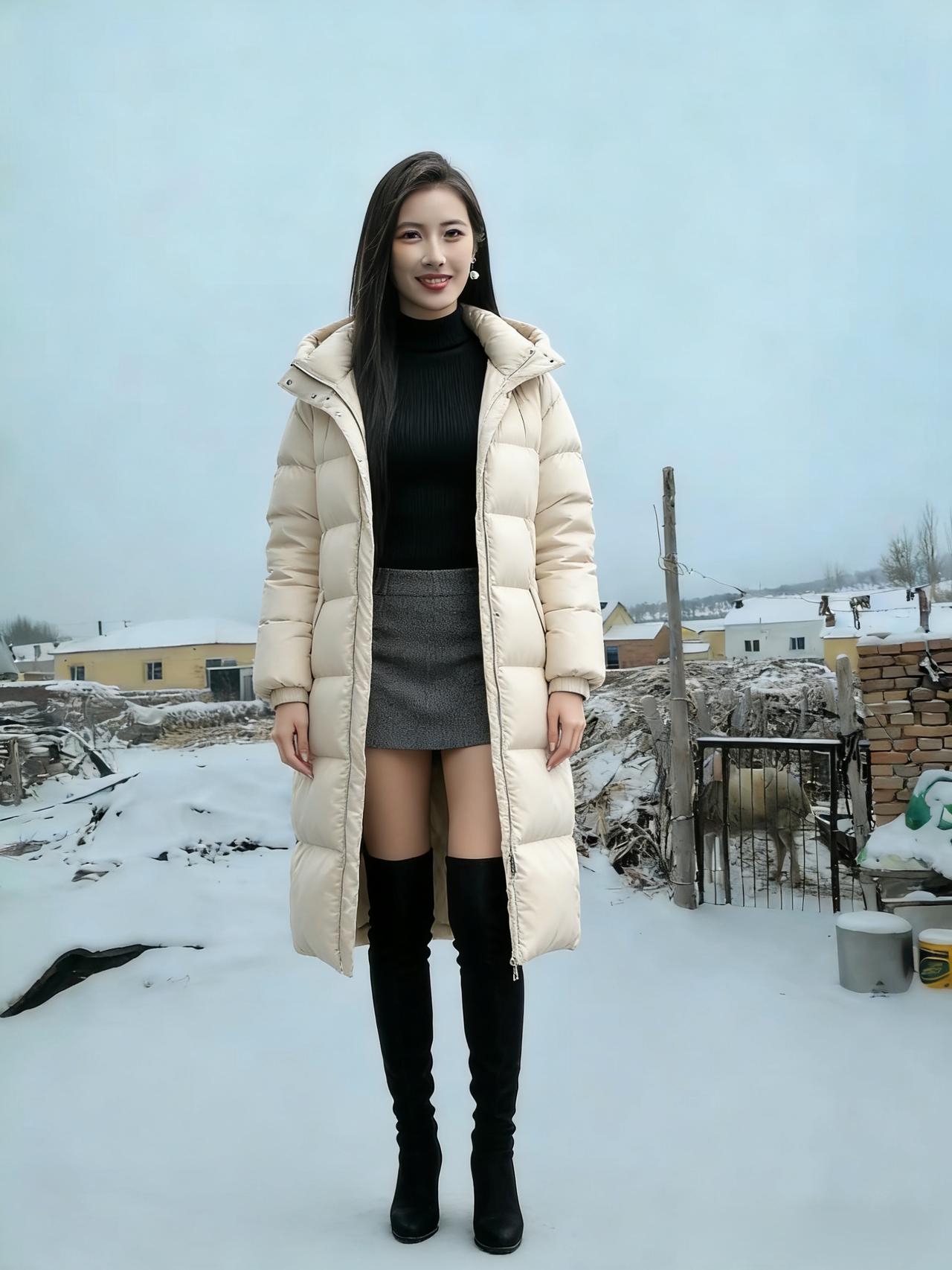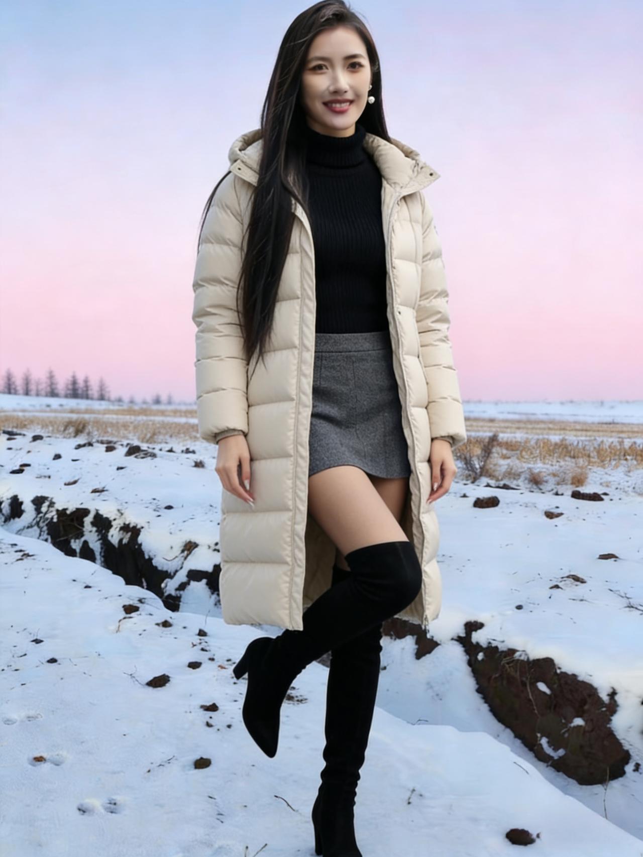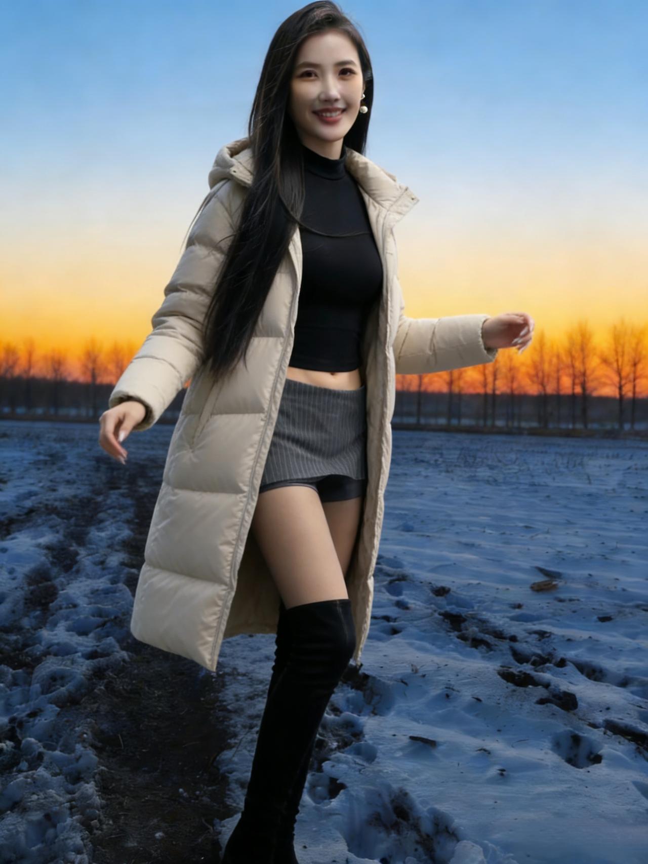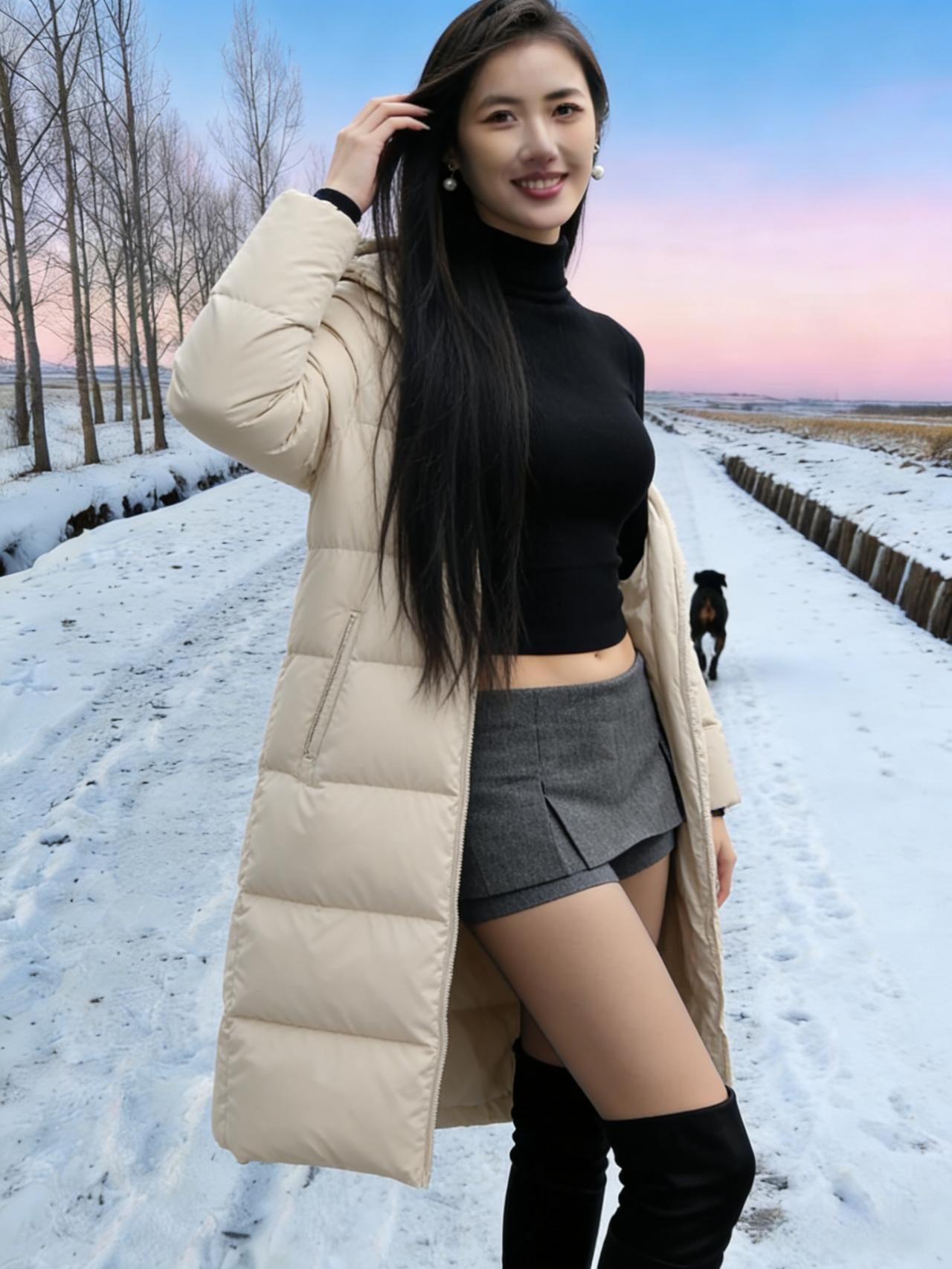 北风掠过垄亩时,雪粒正吻着麦茬的针骨 荒林把枝桠伸向粉紫的天,像摊开的枯笔 她从雪径走来,长款羽绒的米白 是冻土上洇开的一缕温柔的光 ~ 高领黑衫裹着肩头的风,露脐处跳脱的暖 撞碎了冬日的沉郁—— 灰呢短裙裁开雪的素净,过膝长靴敲着冻土 每一步,都让雪粒簌簌落向黑色的裙摆 ~ 黑狗踩着雪痕一步步走远 她的笑比天边的霞色更软 树影瘦成竖线,衬着她抬手拢发的弧度 发丝垂落,像未融的墨淌在雪野 ~ 双臂交叠时,羽绒服的褶皱叠着旷野的静 身后的松林凝着霜,雪沟裂出深褐的土 她站在那里,不是冬日的过客 是雪地里突然绽开的、鲜活的花朵 ~ 村落的黄墙在雾里晕开轮廓 雪堆掩着柴垛,铁桶凝着冰碴 她的身影穿过农家的院角 把都市的精致揉进乡土的粗粝 ~ 落日熔金时,她踏雪而来 条纹裙边扫过冻硬的田垄 长靴碾过残雪,溅起细碎的银光 像把夕阳的碎屑踩在了脚下 ~ 树影映着冰面,她抬手的瞬间 风卷着雪沫掠过指尖 羽绒服的摆角扬起,兜住半缕晚霞 她的步履轻扬,如燕影掠过寒川 ~ 这乡野的冬,本是灰白的长卷 她是笔尖突然落下的浓彩 把雪的冷、霞的暖、土的厚 都揉进了自己的青春靓丽的模样 ~ 雪野茫茫,她站成唯一的火焰 不是烧荒的野火,是温软的、亮着的 让冻土有了心跳,让枯林有了凝望 让冬日的乡村,藏起了凛冽,露出了温柔的美妆