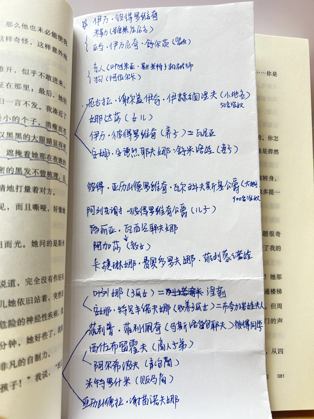 因为人命又长又多的关系,我一般在看俄罗斯文学时会把书中的人物用笔写下来,便于去理清几条人物线之间的关系,这有利于我更好地读懂和理解整个故事。我十分推荐喜欢陀思妥耶夫斯基的读者去看看这本引人入胜的好书。