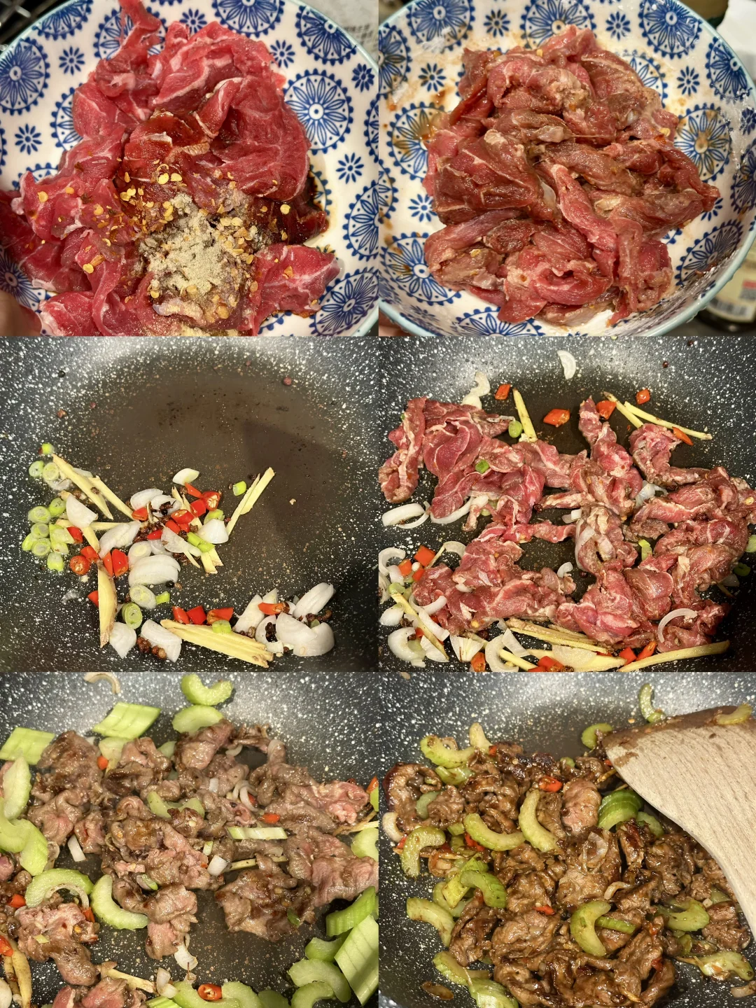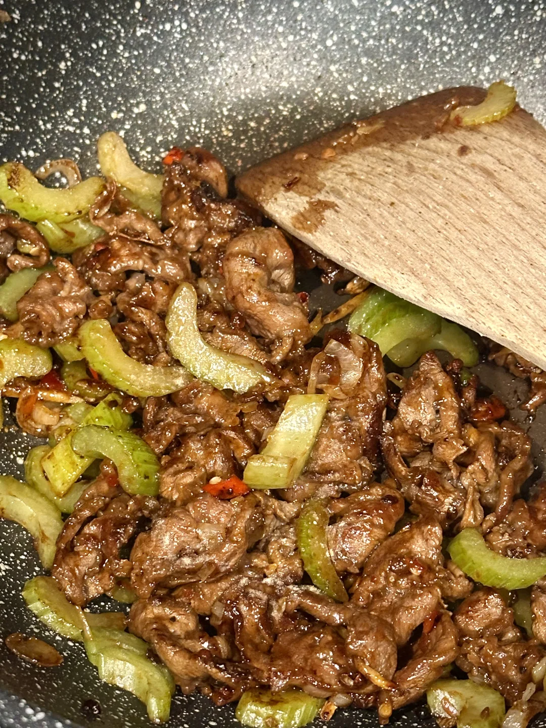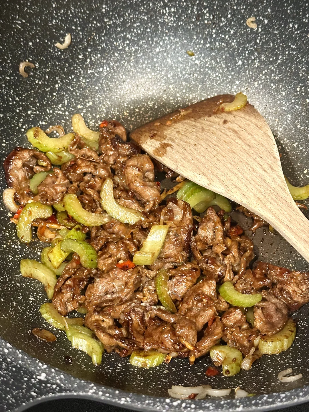 下腌好的牛腱子,猛火翻炒到断生,放入芹菜,加生抽蚝油和少许白糖,快速翻炒;
