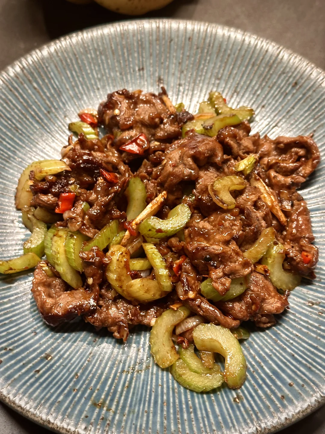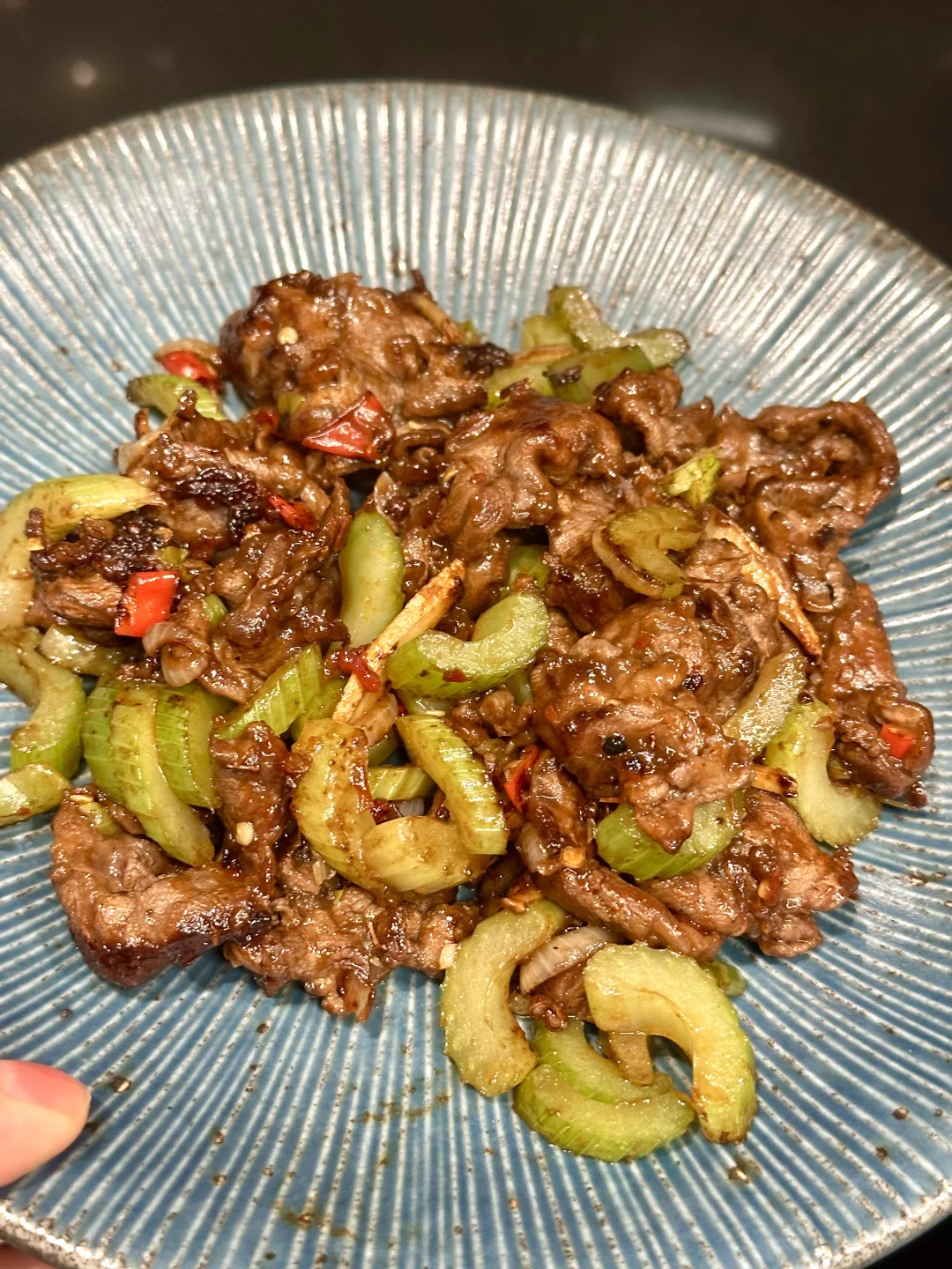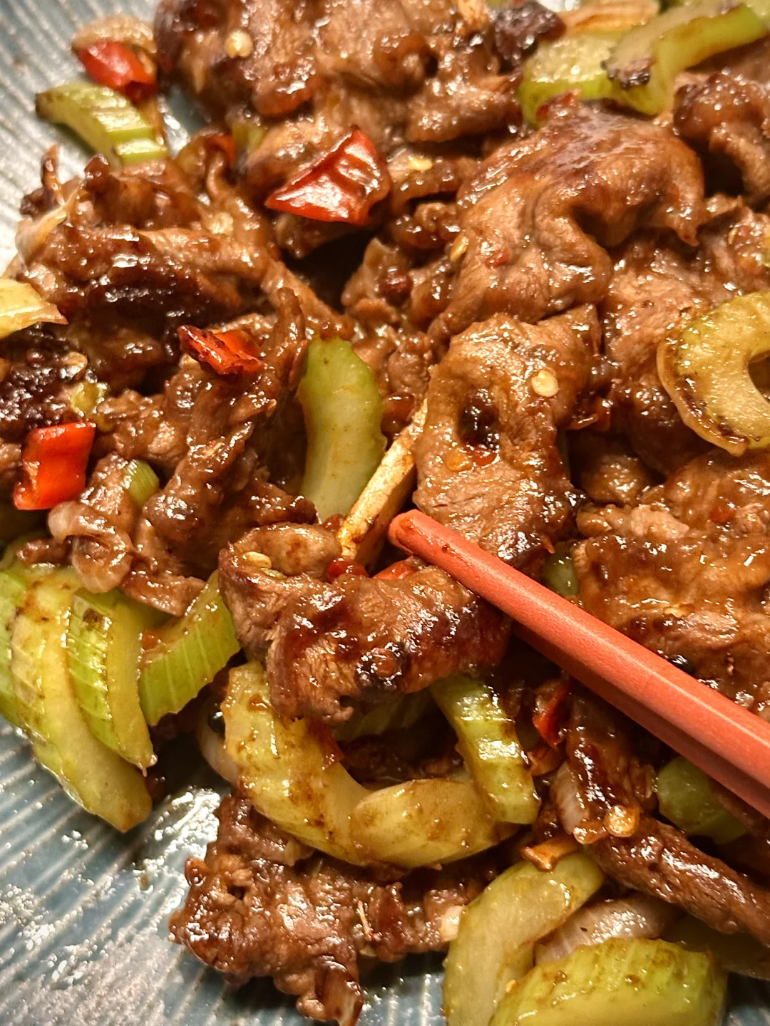 下腌好的牛腱子,猛火翻炒到断生,放入芹菜,加生抽蚝油和少许白糖,快速翻炒;