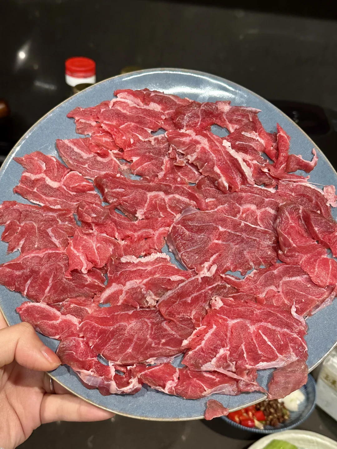 牛腱子建议冰箱冻2-3小时,从冷柜里取出的话解冻到半化即可,这样比较方便切薄片;