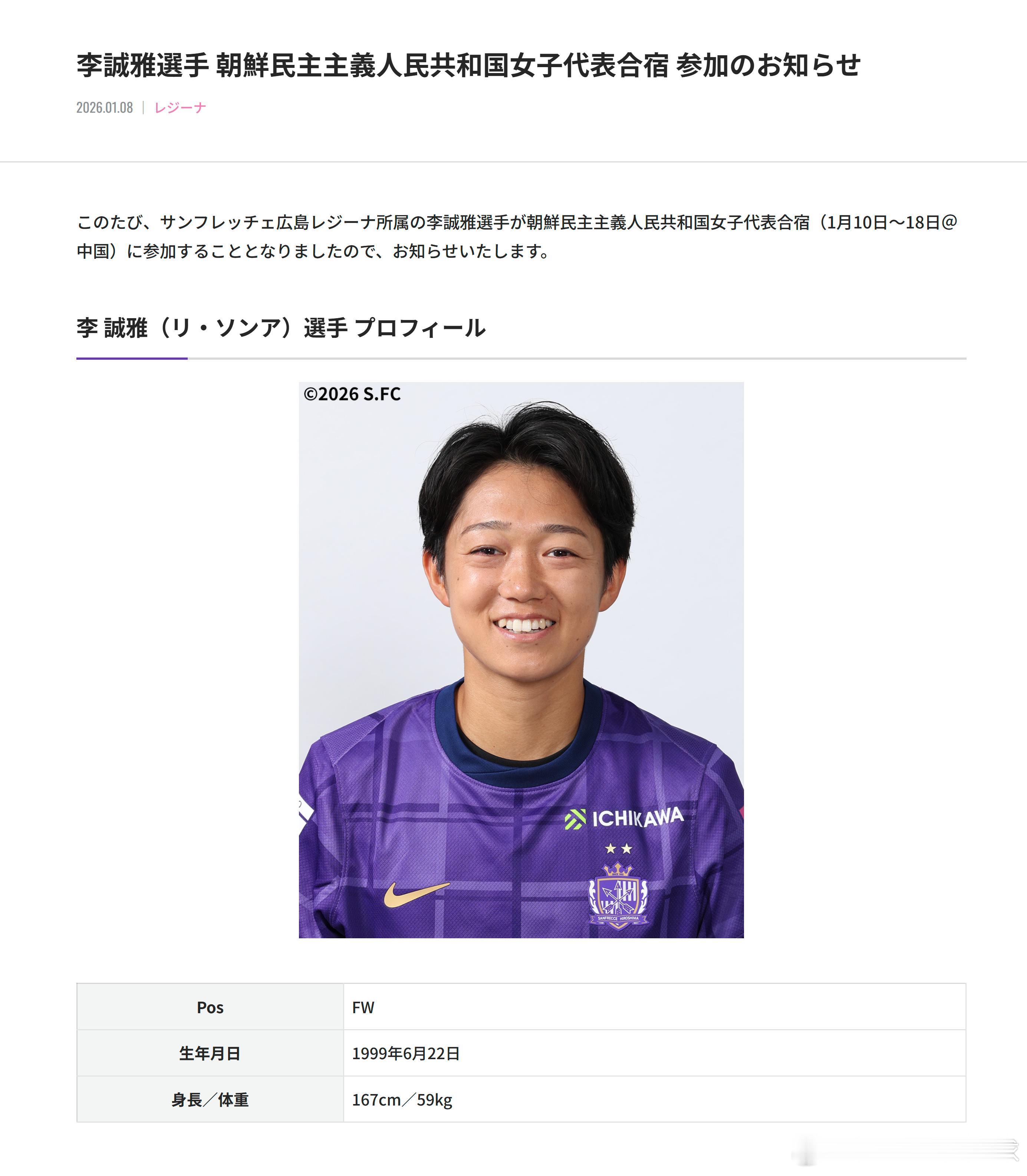 Sanfrecce広島REGINA 前锋李誠雅入选朝鲜女足集训名单,此次集训将于1月10日-18日在中国举行。
