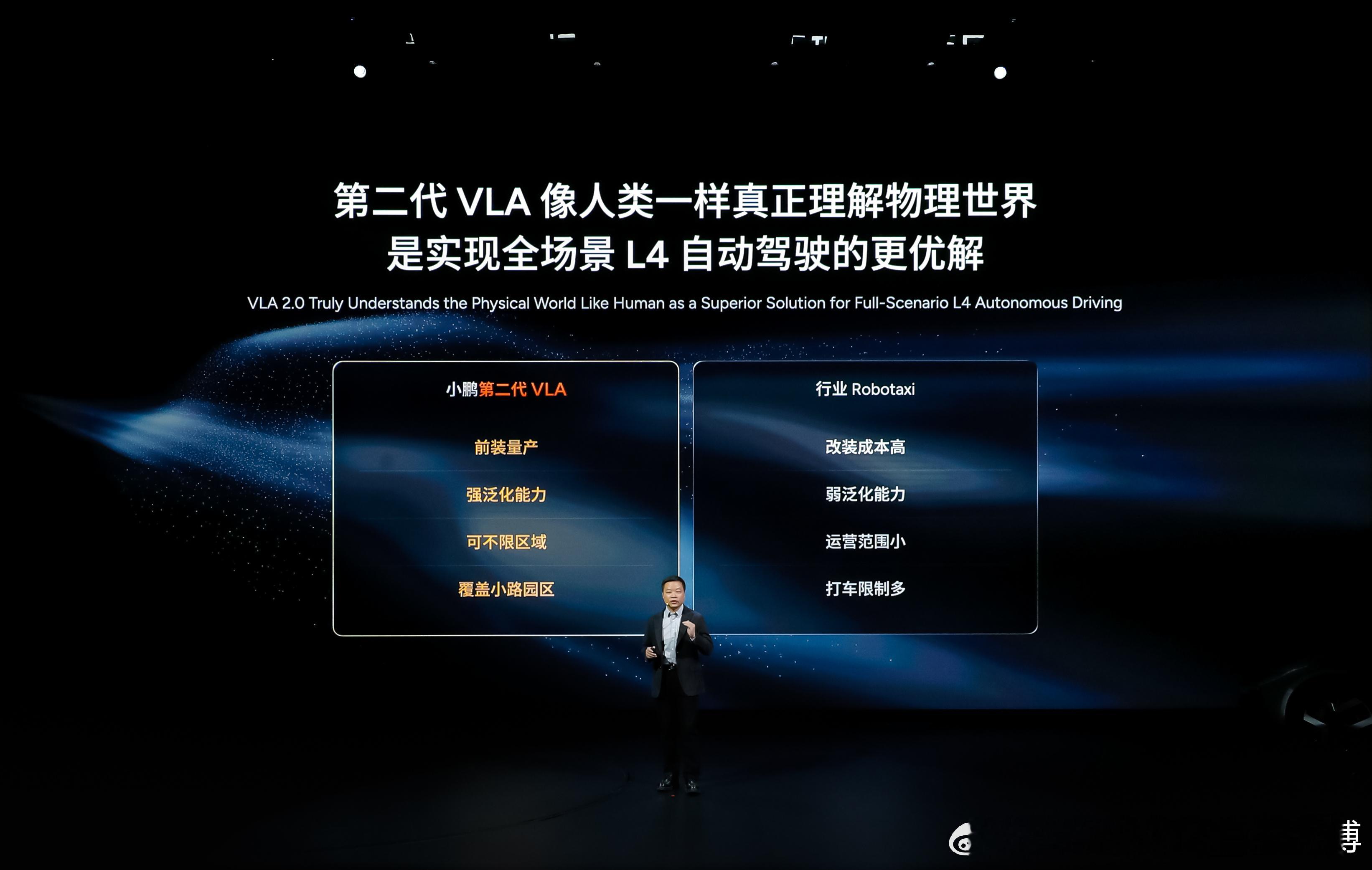 小鹏第二代VLA可同时实现L4自动驾驶能力以及Robotaxi的无人驾驶功能,2026年中国和美国将迎来真正的自动驾驶元年。小鹏第二代VLA有别于市面上的Robotaxi 方案,具备前装量产、强泛化能力、可不限区域、覆盖小路园区的特性,它将通过大量学习,像人类一样真正理解物理世界,是实现全场景L4自动驾驶的更优解。搭载小鹏第二代VLA软件的Robotaxi已经通过第三方测试机构场地测试,即将开始公开道路测试。小鹏新年四车齐发小鹏第二代VLA将于26年一季度开启推送