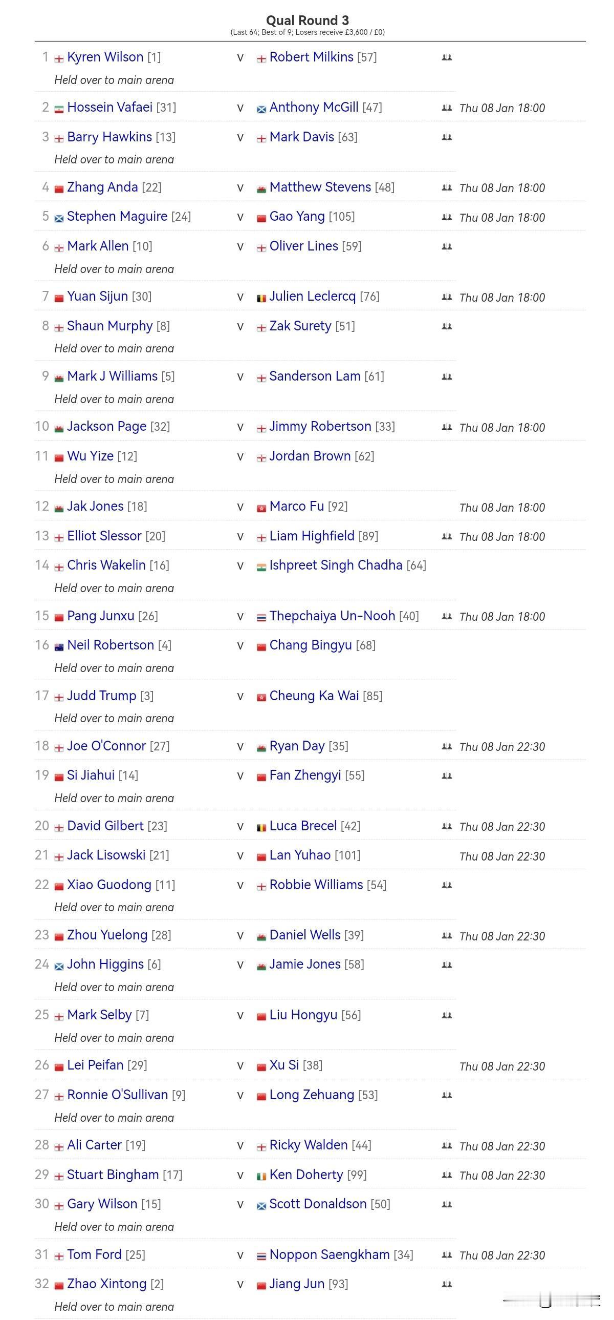 德国大师赛资格赛第三轮今天开打,9名中国球员今天出战,其他6名中国球员将陪前16球员赴德国柏林参加延期资格赛。 今天出战的9名中国球员的对阵如下,其中一场德比。 18点: 张安达vs史蒂文斯 高阳vs马奎尔 袁思俊vs勒克莱尔 傅家俊vs杰克·琼斯 庞俊旭vs塔猜亚 22点30分: 蓝裕豪vs利索夫斯基 周跃龙vs威尔斯 雷佩凡vs徐思 另外,陪前16球员赴德国柏林参加1月26日延期资格赛的6名中国球员的对阵是: 常冰玉vs尼尔·罗伯逊 张家玮vs特鲁姆普 范争一vs斯佳辉 刘宏宇vs塞尔比 龙泽煌vs罗尼·奥沙利文 江俊vs赵心童。 前16球员中参赛的中国球员是:赵心童、吴宜泽、肖国栋、斯佳辉,丁俊晖没有报名参赛,成为前16中唯一缺席球员。 延期资格赛,除了上面提到的赵心童和斯佳辉的对阵外,吴宜泽将对阵乔丹·布朗,肖国栋将对阵罗比·威廉姆斯。