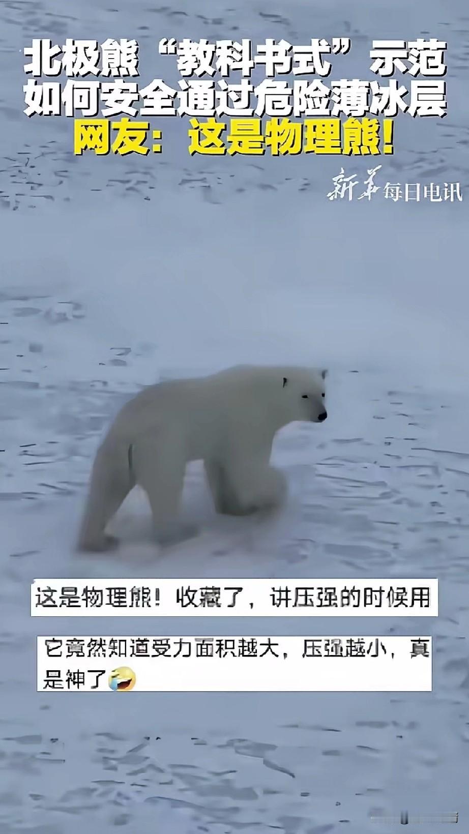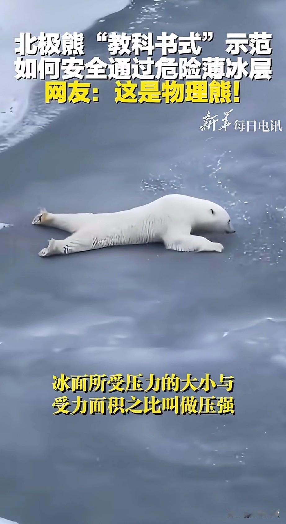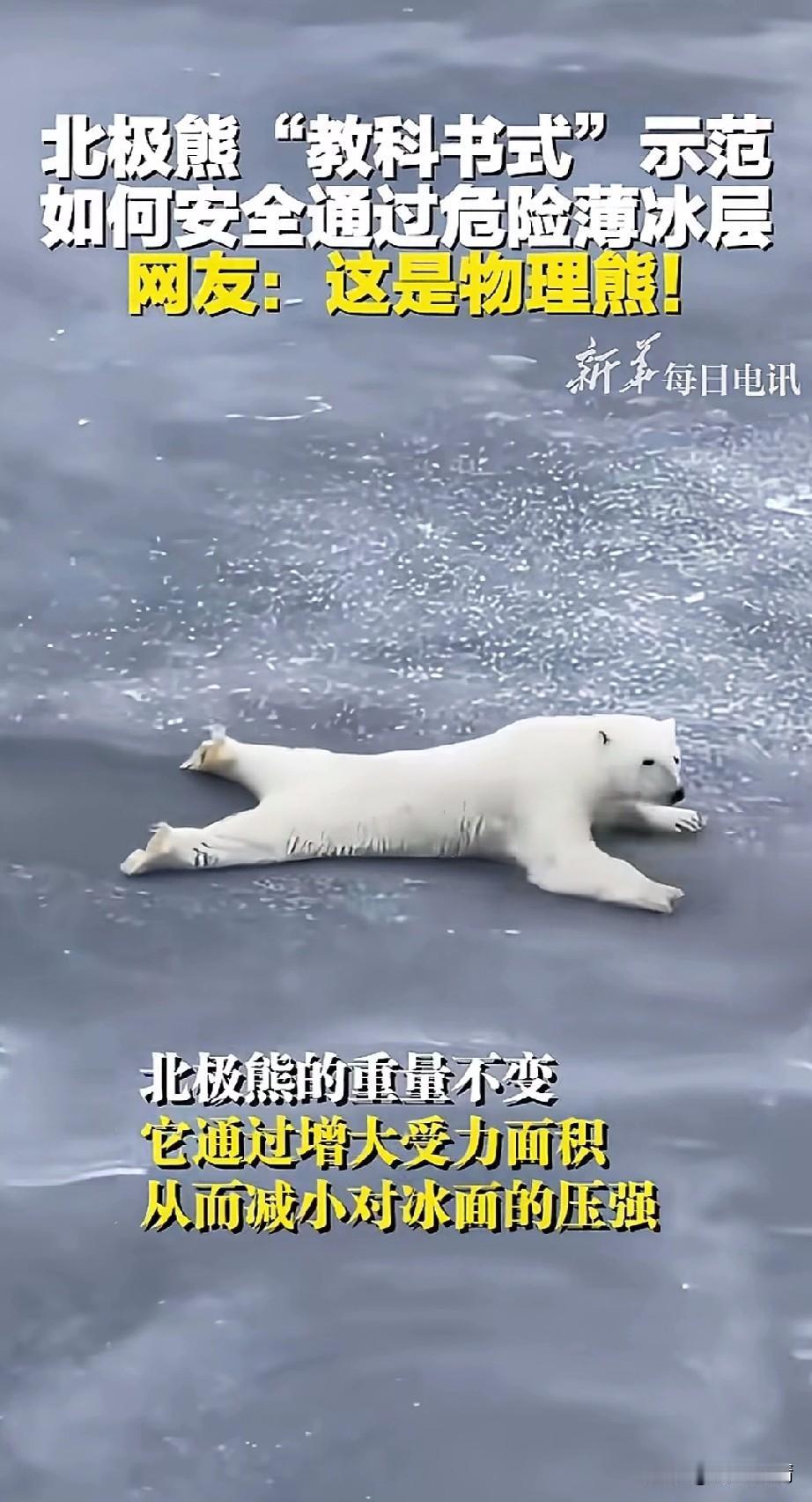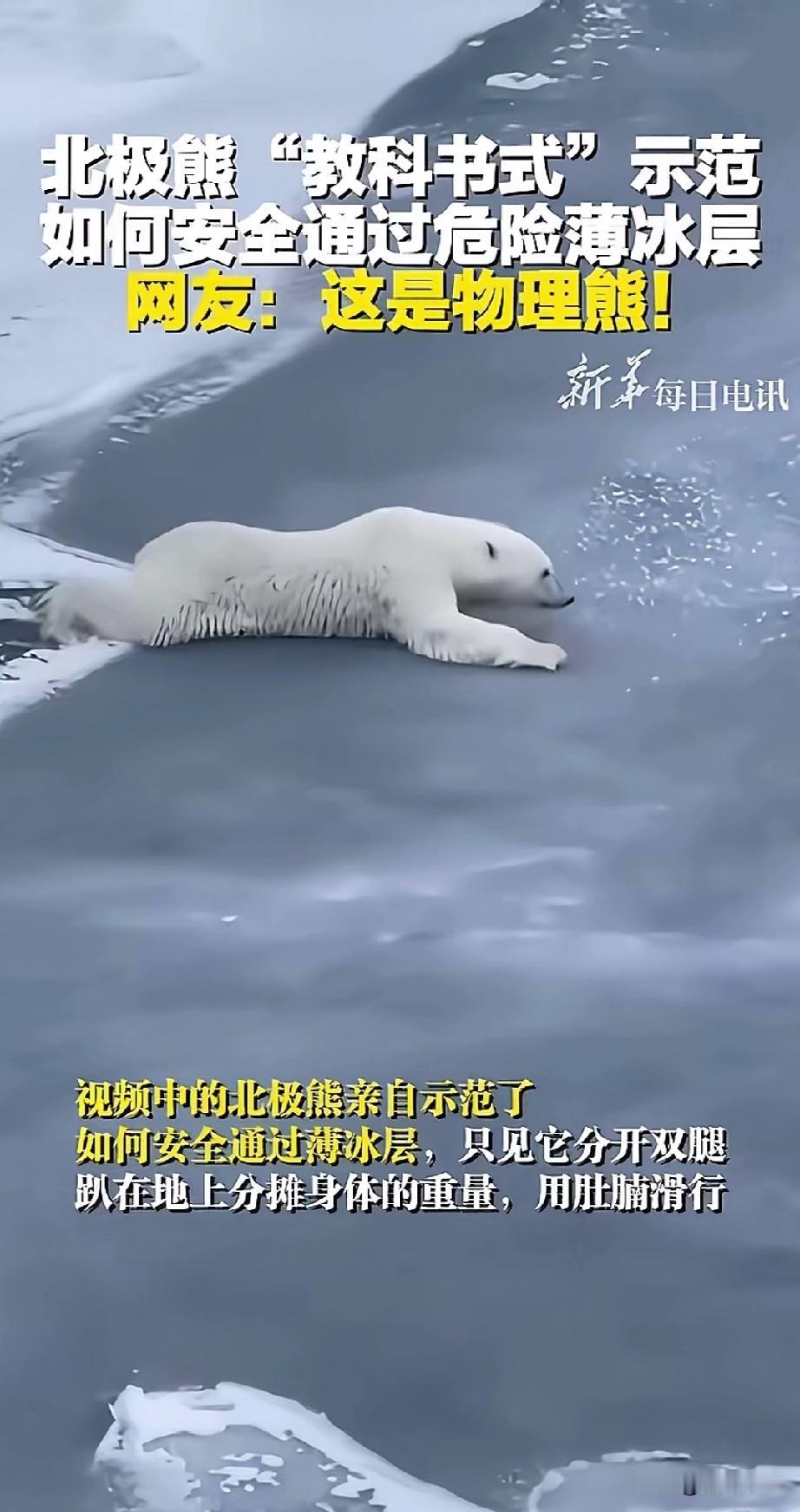 北极熊教科书示范火了, 它在通过薄冰层的时候, 不小心掉进去了, 它也意识到他的危险, 不过它并没有慌乱, 而是用自己有力的两只前爪, 向前方的冰面扒去, 整个身体匍匐起来, 慢慢的它爬出了冰洞, 然后双脚伸平, 缓缓的向前爬去, 将全身的重力分布在身体各个部分, 就这样慢慢的爬向了远处的坚冰, 确认通过了危险的薄冰面之后, 它才重新用四肢站了起来, 这段视频被人录下来之后, 在网上疯传, 这简直是教科书般的示范, 许多网友看了之后, 表示这是只物理熊, 它居然知道在薄冰面之上, 趴着可以分散全身的重力, 这以后教急救知识的时候, 直接放这段北极熊的视频就可以了, 保证小朋友们看一遍就会了! 大家觉得北极熊教科书般自救好玩吗? 北极熊 发生冰面溺水怎么办? 极地北极熊 北极熊色调 极地北极熊 冰岛北极熊
