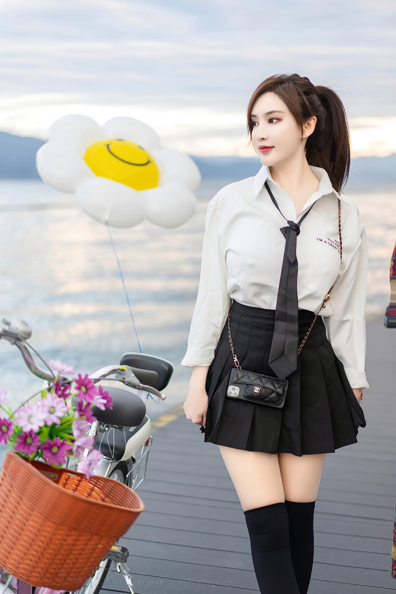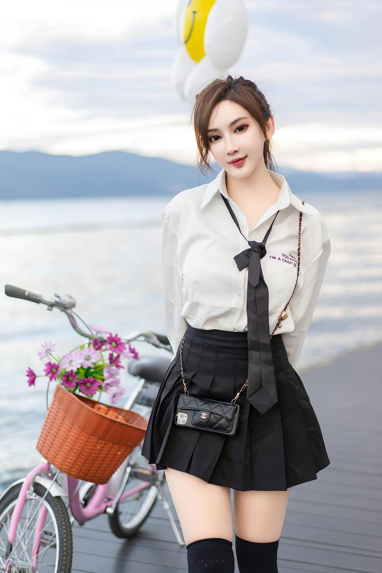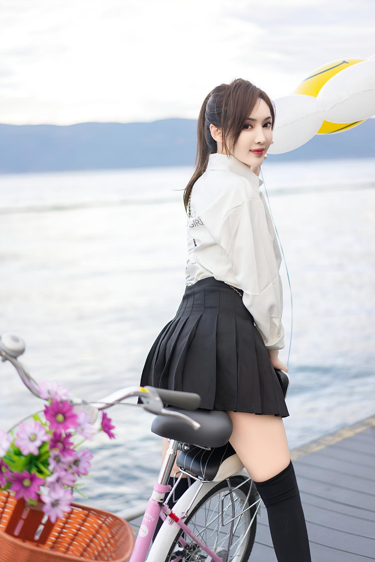 少女心爆棚的湖边骑行,粉车+花篮+微笑气球,完美搭配!💖🚴♀️🌸🎈