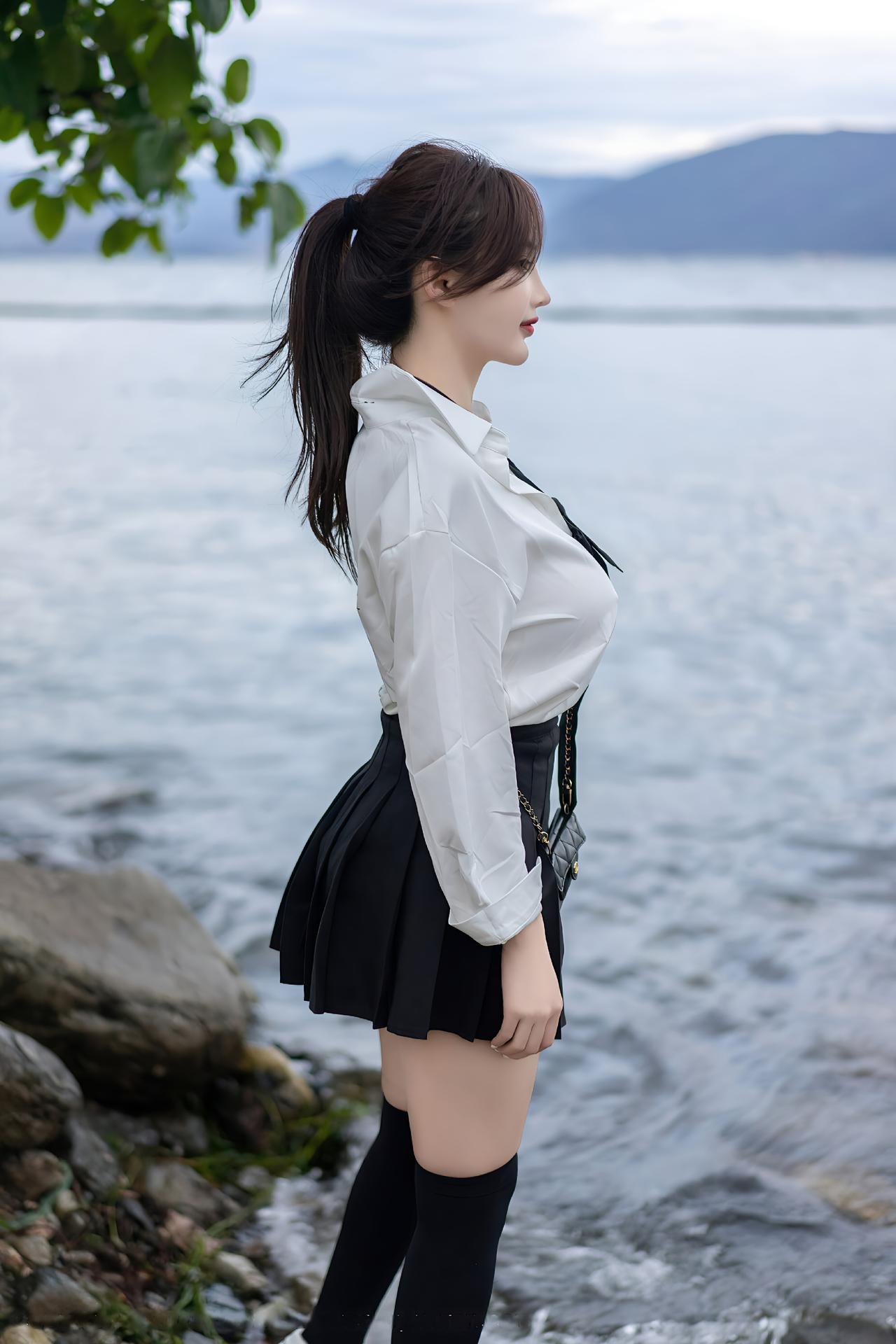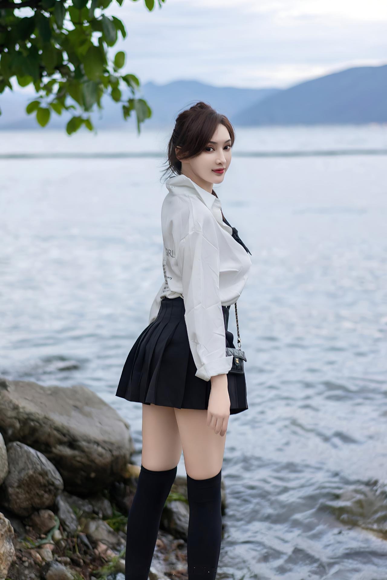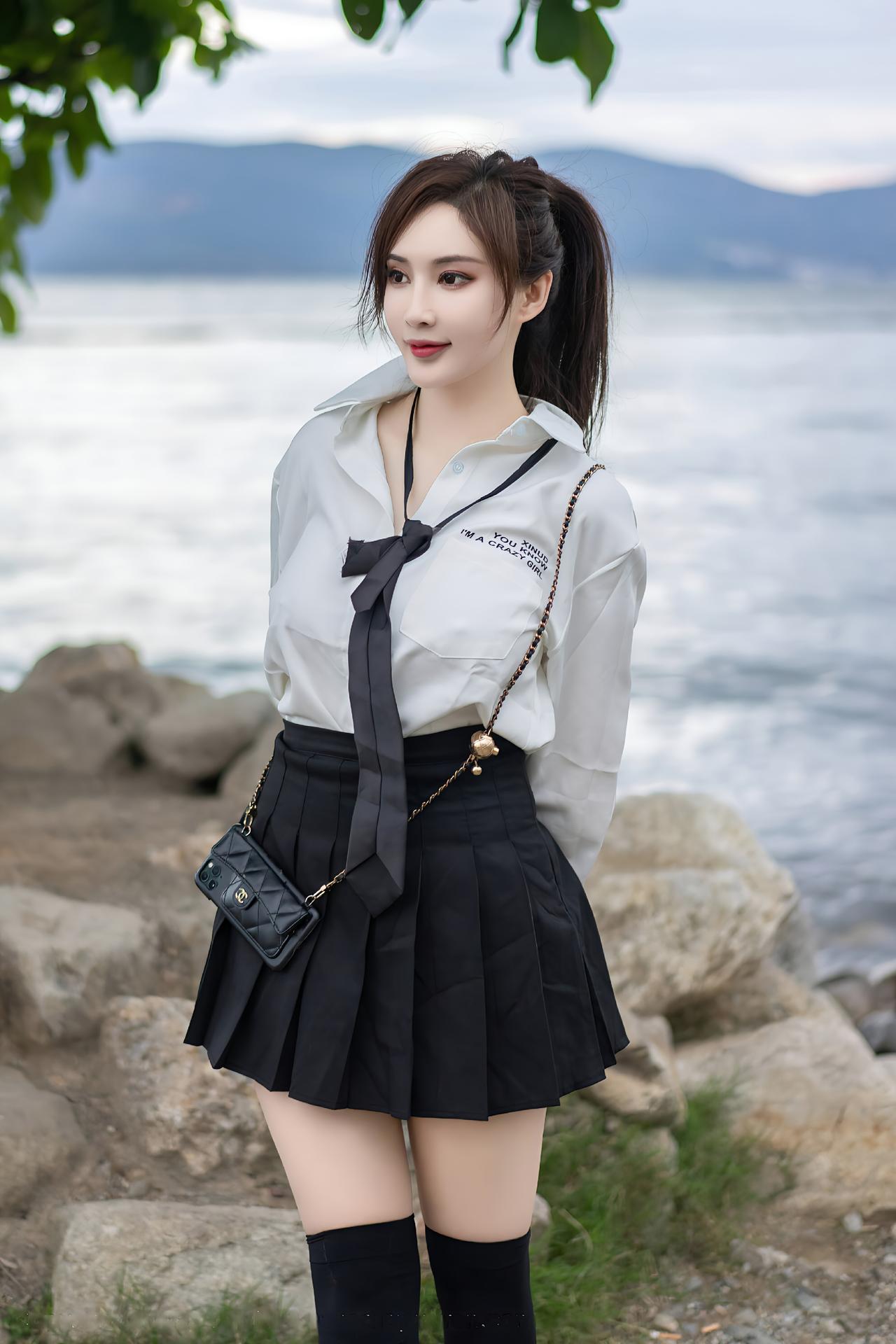 甜美少女风穿搭,白色上衣+黑色短裙,清新自然,少女心满满!