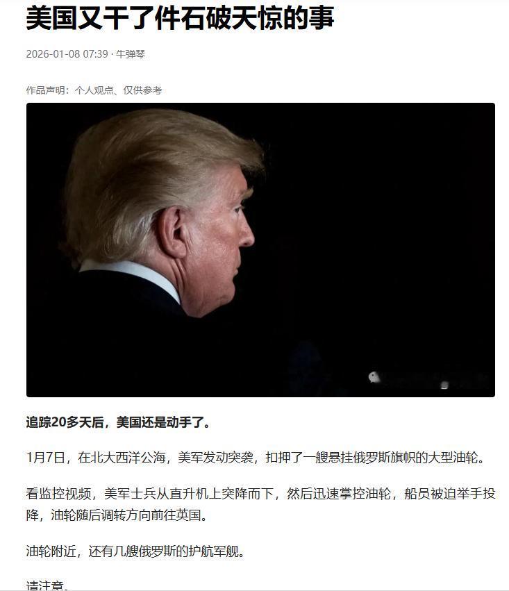 看了牛弹琴老师的这篇文章后,简直被美国的霸权行径气得咬牙! 美军竟敢在北大西洋公海,当着俄罗斯护航舰艇的面突降扣押俄籍油轮,把国际法和航行自由当摆设。 这哪里是执法,分明是 21 世纪的海盗行为!特朗普政府继抓捕马杜罗后愈发肆无忌惮,为绞杀委内瑞拉石油出口,竟在公海肆意妄为,这种 “实力即规则” 的丛林逻辑,让国际秩序蒙羞,也给世界埋下冲突隐患,实在令人愤慨! 查看原文链接:
