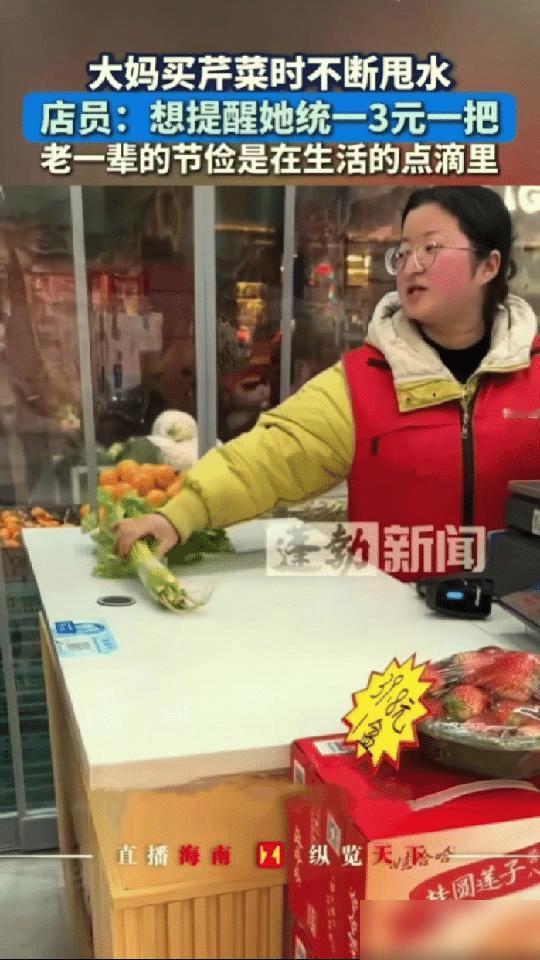 笑不活了!陕西,一位大妈去超市买芹菜,发现上面有水,于是拿起来疯狂甩,胳膊都抡酸了,不料结账时收银员一句话让她直接懵了,白忙活一场。 这事儿说起来特别有画面感。大妈在生鲜区挑中一把芹菜后,为了不给那点水珠买单,站在货架旁使出全身力气狂甩,甩到胳膊都酸了才满意。结果结账时收银员轻飘飘来一句“阿姨,这菜3块钱一把”,直接让大妈的努力瞬间归零。 最逗的是大妈当时的反应,先是僵在原地老脸一红,紧接着自己拍着大腿笑喷了。这种反应特别真实,完全就是咱们自家那些“算计了一辈子却栽在规则更新上”的长辈,自带一种纯朴的喜感。 其实我挺感慨这种心态的。现在超市为了效率,越来越多生鲜都改成了按份或者计件卖,可老一辈人的思维还停留在那个“两两计较”的秤杆时代。 这种信息差让她们的生存智慧一下子落了空。虽然在旁人看来是“努力但无用”,但对她们来说,买菜甩水、剥掉老叶已经成了一种刻在骨子里的本能。 我甚至能想到很多网友提到的共鸣,自家亲妈买个菠菜能甩十分钟,恨不得甩到脱水才罢休。这种劲头其实甩的不是水,而是她们对生活那份细致入微的经营。 虽然这次大妈确实是白忙活了,但这种不舍得浪费、一分一毫都要计较的劲头,反而让人觉得很有烟火气。 在这个什么都讲究快的时代,这种甚至显得有点笨拙的精打细算,其实也是老一辈人对日子的一种敬畏。 笑着笑着反而觉得挺暖的,希望这种对生活认真的劲头,不管到什么时候都别丢了。