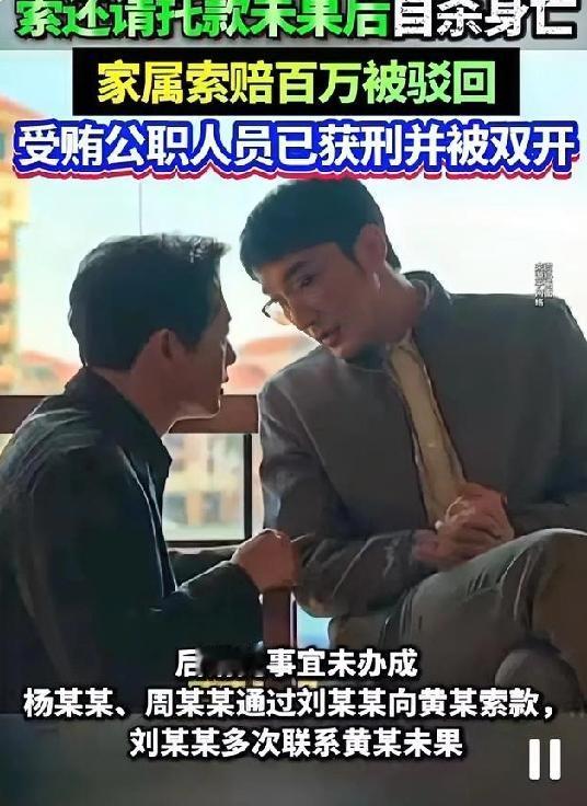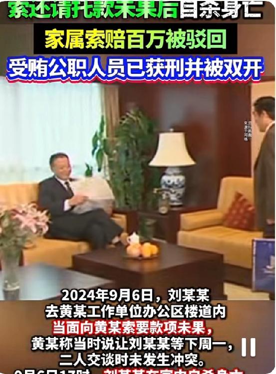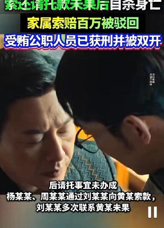 男子作为中间人找公职人员办事结果事没办成钱还没了,于是选择自杀,家属索赔127万余元被驳回! 2026年1月8日,聊城市中级人民法院对男子刘某某向公职人员索要请托款未果后自杀、家属索赔127万余元的上诉案作出终审判决,驳回上诉维持原判,法院明确认定无证据证明自杀与讨款催款存在直接关联。 案件要追溯到2023年8月,杨某某建了一个鸡棚,但是该鸡棚属于违规建造,需要拆除,于是杨某某通过中间人刘某某介绍向黄某(当时任职聊城市国土空间开发保护中心湖西中心所所长)转账2万元。2024年1月,周某某为改变土地性质建房,又经刘某某之手向黄某支付9000元。然而这两件事都没有办成。于是杨某某、周某某就想要回当初给黄某的钱,为此刘某某多次联系黄某,但是经常电话未接通或被拒接。 2024年9月6日,刘某某前往黄某工作单位办公区楼道当面索款,黄某则表示需要等到下周一处理。令人扼腕的是,当日17时许,刘某某在家中自杀身亡。事发后,刘某某的妻儿认为其死亡是被逼所致,于是将黄某、杨某某、周某某诉至法院,索赔死亡赔偿金等共计127万余元。 一审法院审理查明,黄某因受贿罪已于2025年3月被判处有期徒刑六个月,且已被“双开”。案外人刘某生证实,自杀当日15时50分与刘某某通话时,对方状态一切正常。法院认为,家属主张刘某某是因要钱失败而导致精神崩溃自杀,但是没有直接证据证明自杀与催款行为存在法律上的因果关系,故驳回诉讼请求。二审法院审理后维持了一审判决。 不管是委托人还是中间人通过行贿的方法“走捷径”来解决问题本身就是不合法的,有风险的行为。刘某某作为中间人,事情没有办成钱还要不回来于是选择自杀,这样的悲剧令人唏嘘。他的离世给他的家人妻儿带来的伤痛是不可估量的!这件事也提醒我们做事合法合规才是正道理!