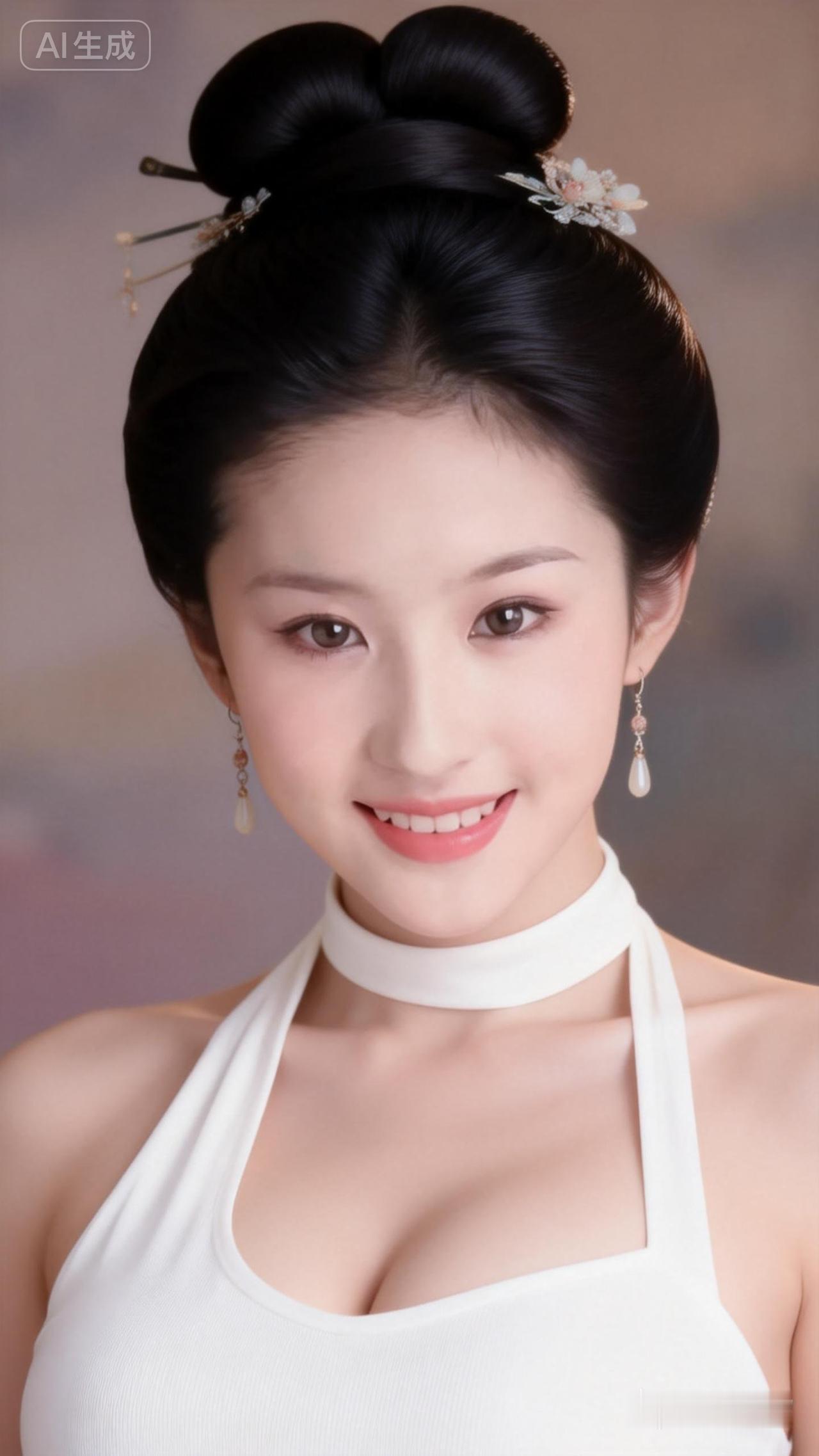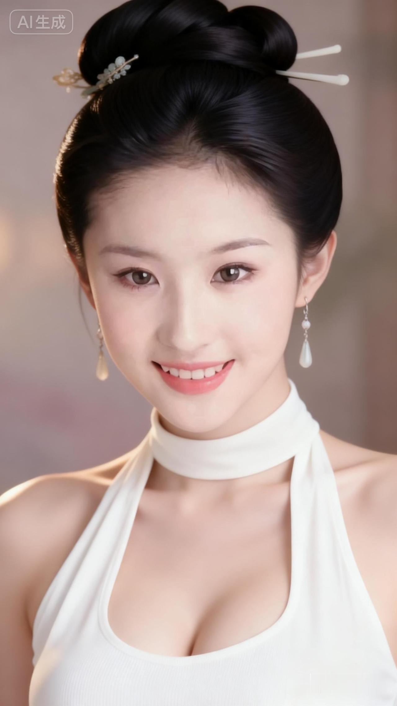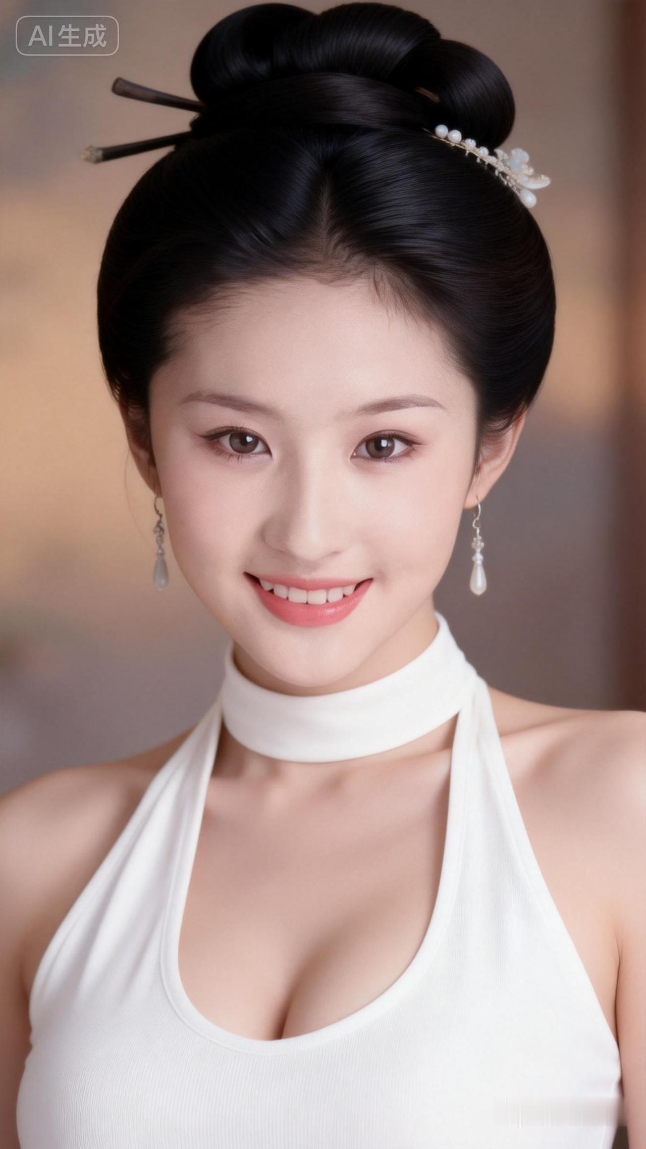 优雅黑发盘发,甜美笑容,时尚白色露肩装,尽显东方古典美!