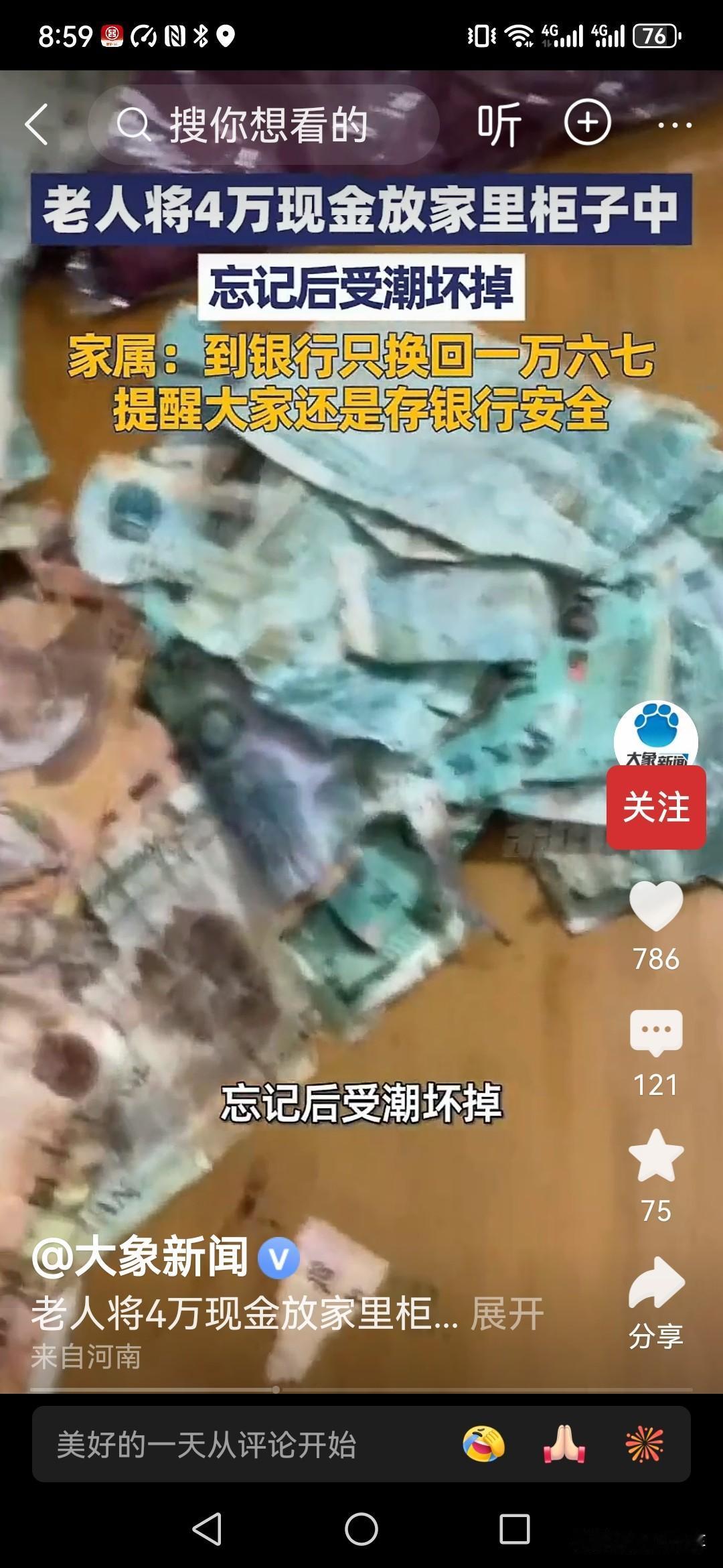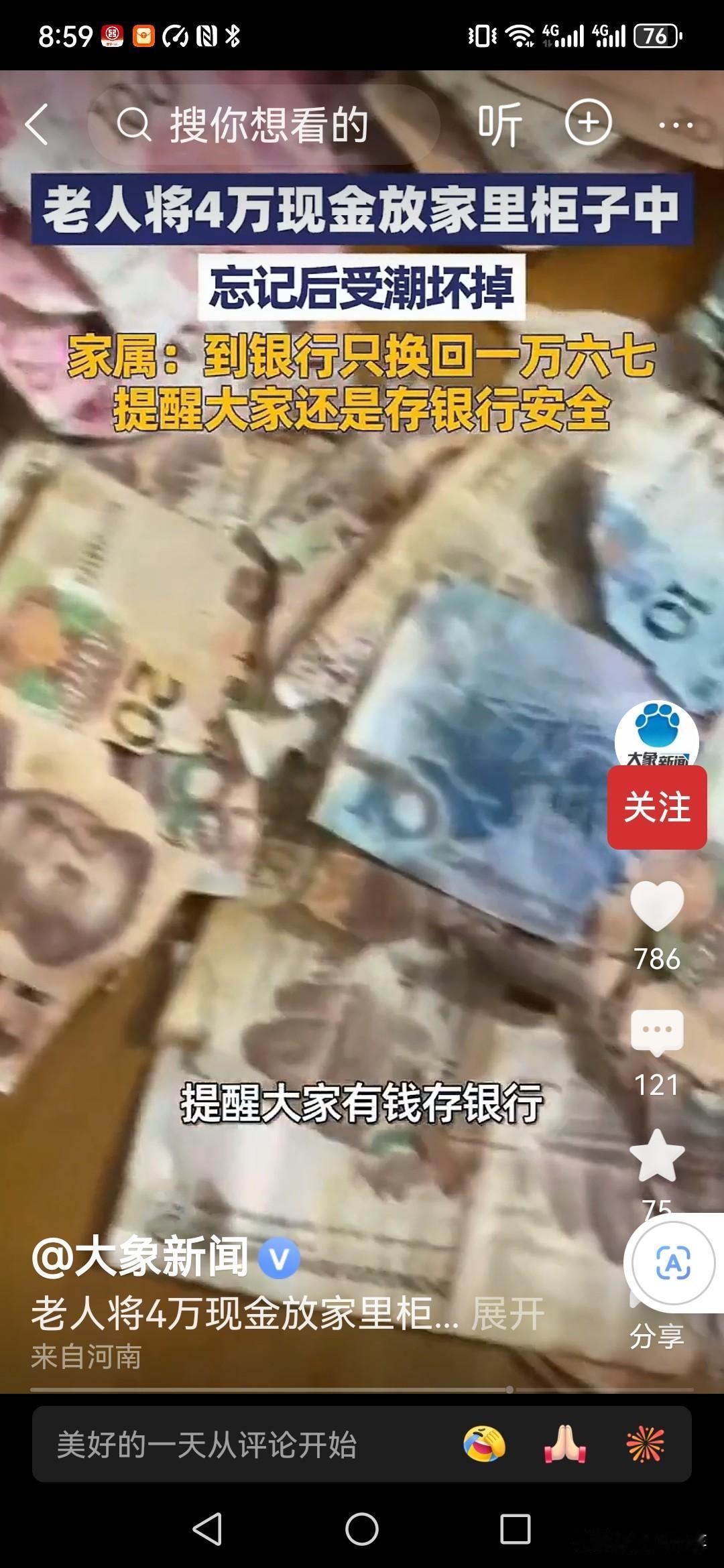 江苏宿迁一位老人将4万元现金放在家中柜子里面, 结果受潮发霉,四万元现金秒变渣,不管是百元现金还是十元二十元全部受潮结块,团成一团了! 虽然老人把所有钱都拿出来晾晒,但是大多数钱还是破碎难以辩识。 最终家属将所有钱拿到银行兑换,只兑换了17000元左右,损失惨重! 在这里也是再次提醒,千万不要把大量现金存在家中,尽量选择存入银行才最保险!