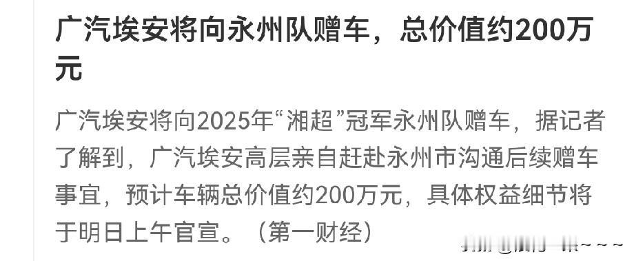 哇塞!太猛了吧?[捂脸] 广汽埃安将向永州队赠车总价值约200万元?这家伙可厉害了,永州队队员发财了呗。这可不仅仅是广告啊,这是支持湘超啊!太厉害了,必将引起明年各城市联赛如火如荼地进行。估计苏超明年也将会加大奖励力度,其他城市足球联赛也不会落后。现在踢足球是越来越好了!