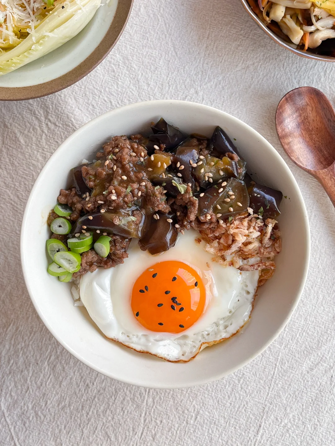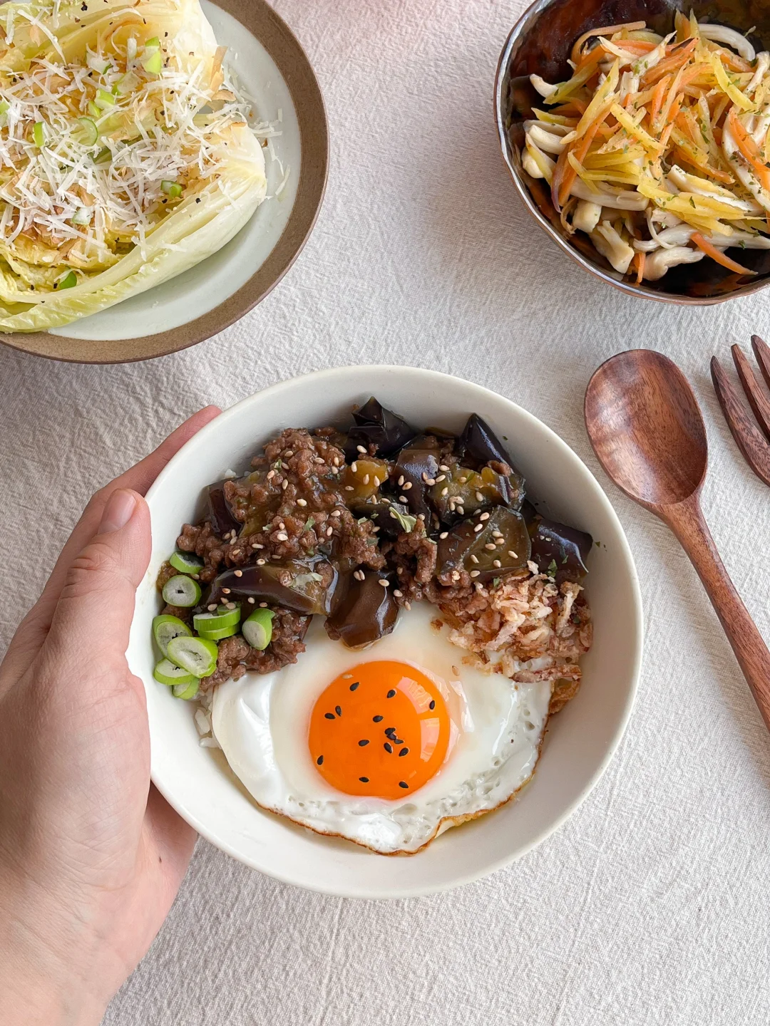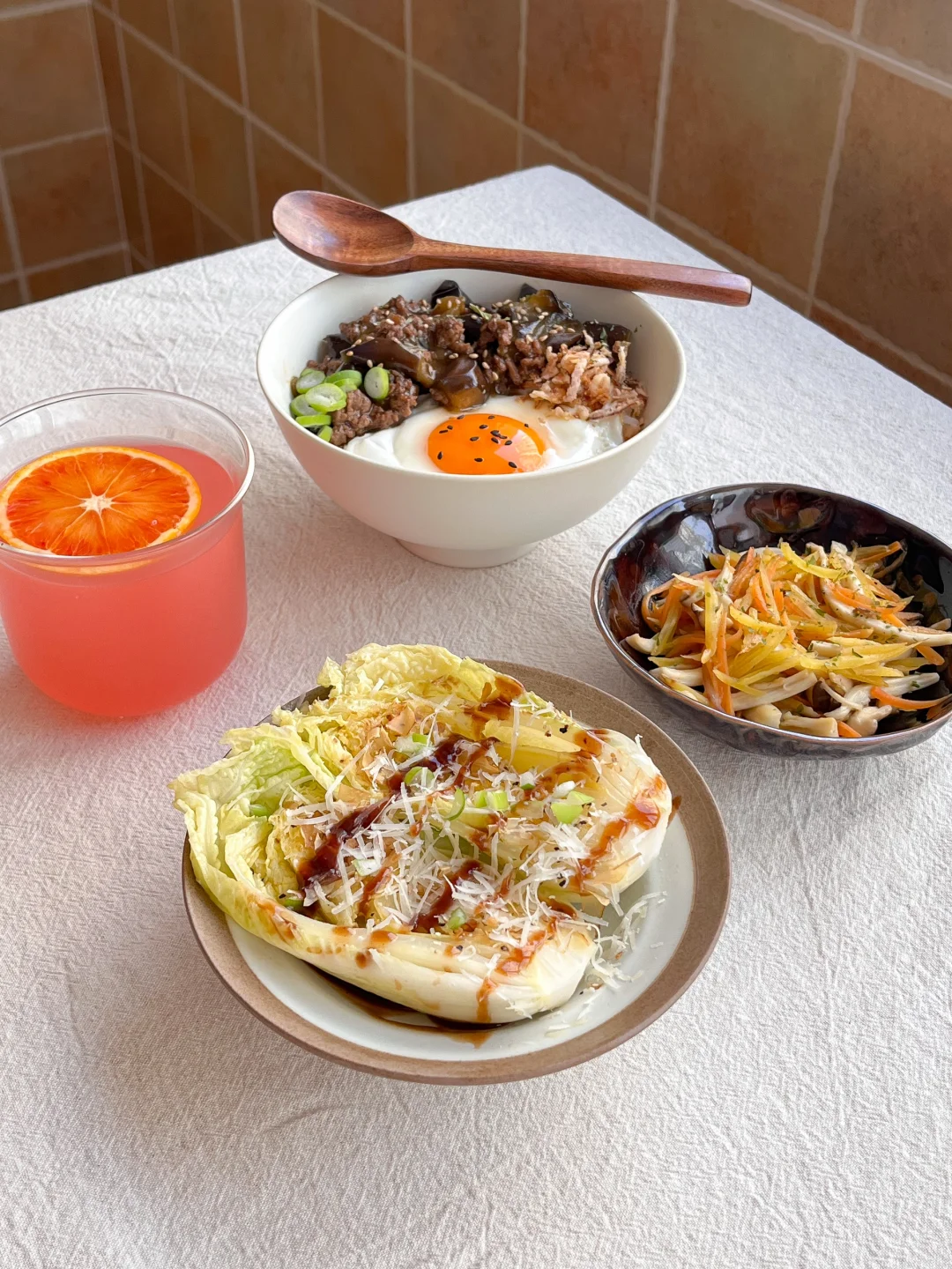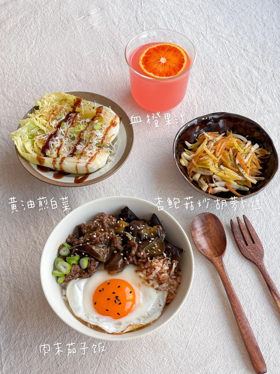 今日午餐: 肉末茄子饭🍆 黄油煎白菜🧈 杏鲍菇炒胡萝卜丝🥕 血橙果汁🧃 今天是简单又营养的一餐 茄子切滚刀块 微波炉加热两分钟 变得软软的就行 这个状态就不会太吸油了 不然茄子料理的油每次都很多 加猪肉馅或牛肉馅 做成肉末茄子饭 煎一颗溏心蛋 加一点炸洋葱碎和芝麻 这样只喷了一点油的低卡茄子饭就做好啦 大家一直喜欢我的餐具 我整理了一点喜欢的 有饭碗和小茶点碟 都是我平时在用的 比较适合一人到两人食吧 精致的小餐具