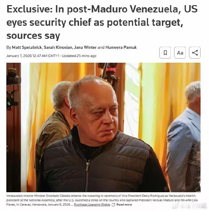 新加坡联合早报今天(1月8日)报道:“三名知情人士透露,特朗普政府已向委内瑞拉强硬派内政部长卡韦略发出警告称,除非他协助临时总统罗德里格斯满足美国的要求,并维持国内秩序,否则可能成为美方的重要打击目标之一。” 特朗普政府希望完全控制委内瑞拉的石油生产与销售,石油销售由美国统管,销售收入汇入美国结算银行,委内瑞拉所需商品一律从美国购买,彻底将该国变成美国的经济殖民地。但是美国的设想遭到委内瑞拉内政部长及国防部长的坚决反对。卡韦略在群众集会上坚称,面对美国的暴行,委内瑞拉人民决不投降,委内瑞拉政府决不做美国的傀儡政权,希望民众相信政府带领国家走出危机。美国眼睁睁地看着其经济殖民计划落空,恼羞成怒,向委内瑞拉内政部长及国防部长发出死亡威胁。