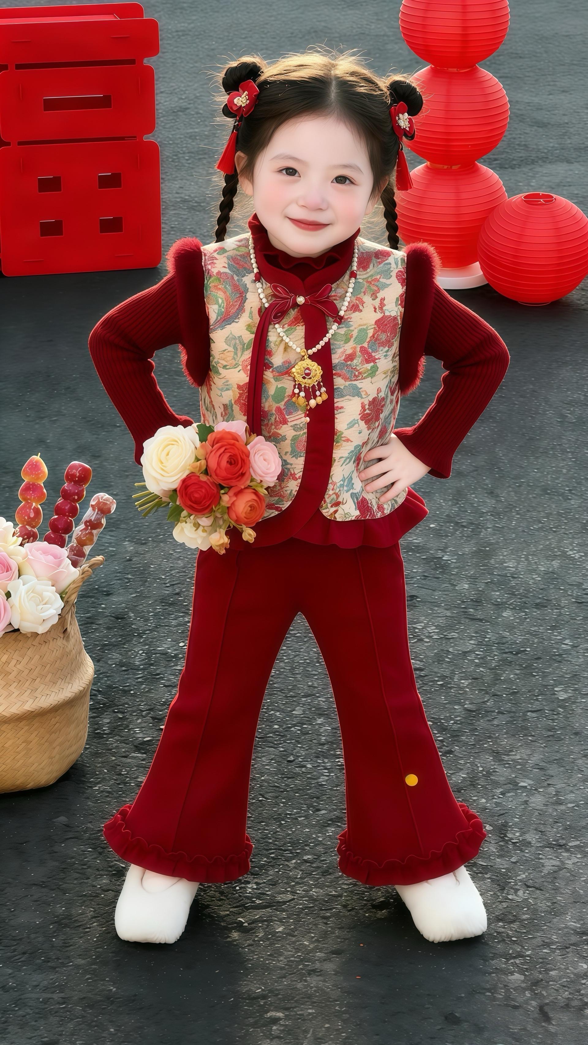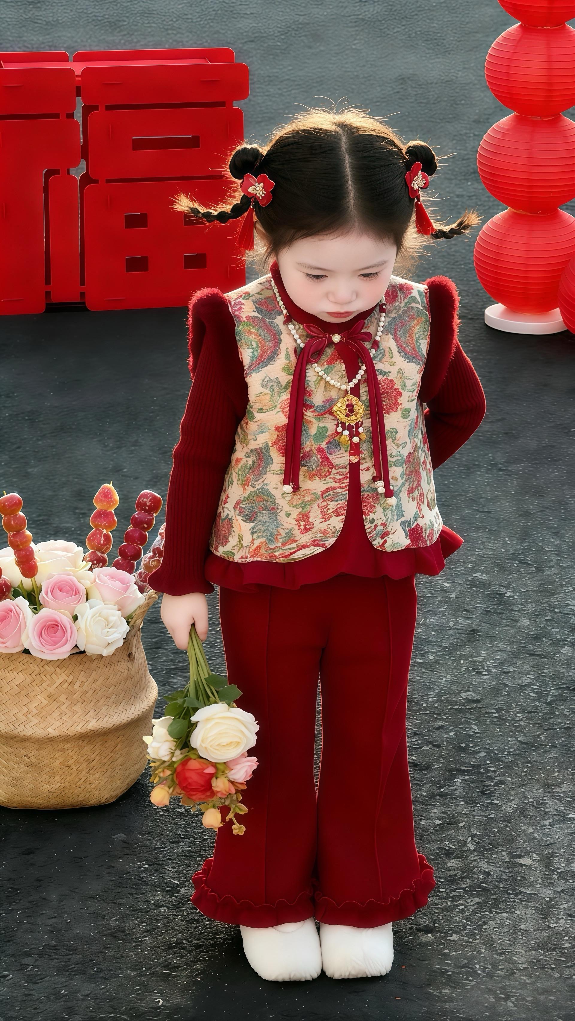 萌娃新年战袍必须冲!穿上它的女宝也太可爱了吧~精致五官搭甜系妆容,红蝴蝶发夹点睛超吸睛!户外 asphalt 路配红灯笼福字,随手拍都是大片感~舒适又好看,过年串门回头率爆棚!