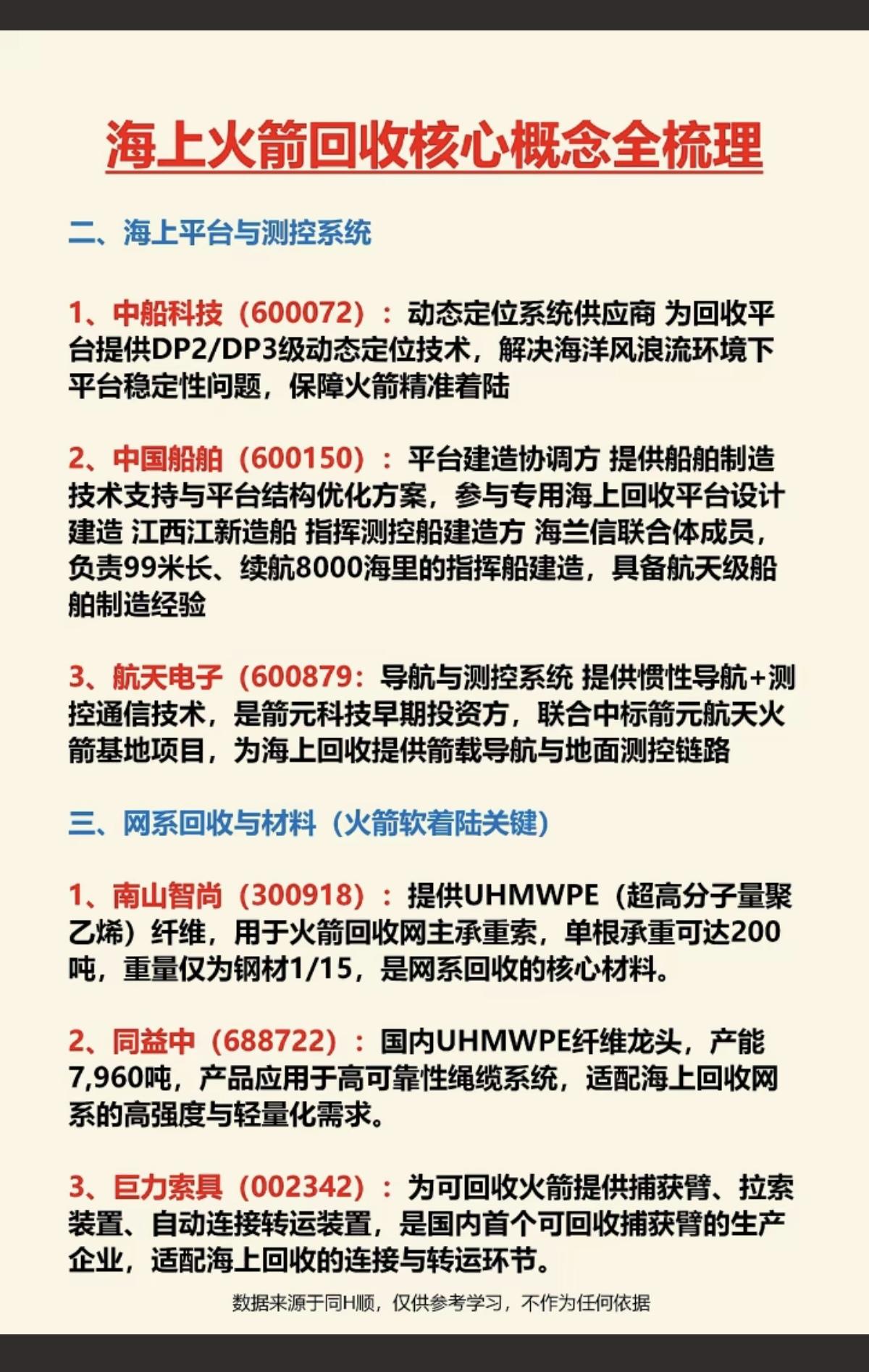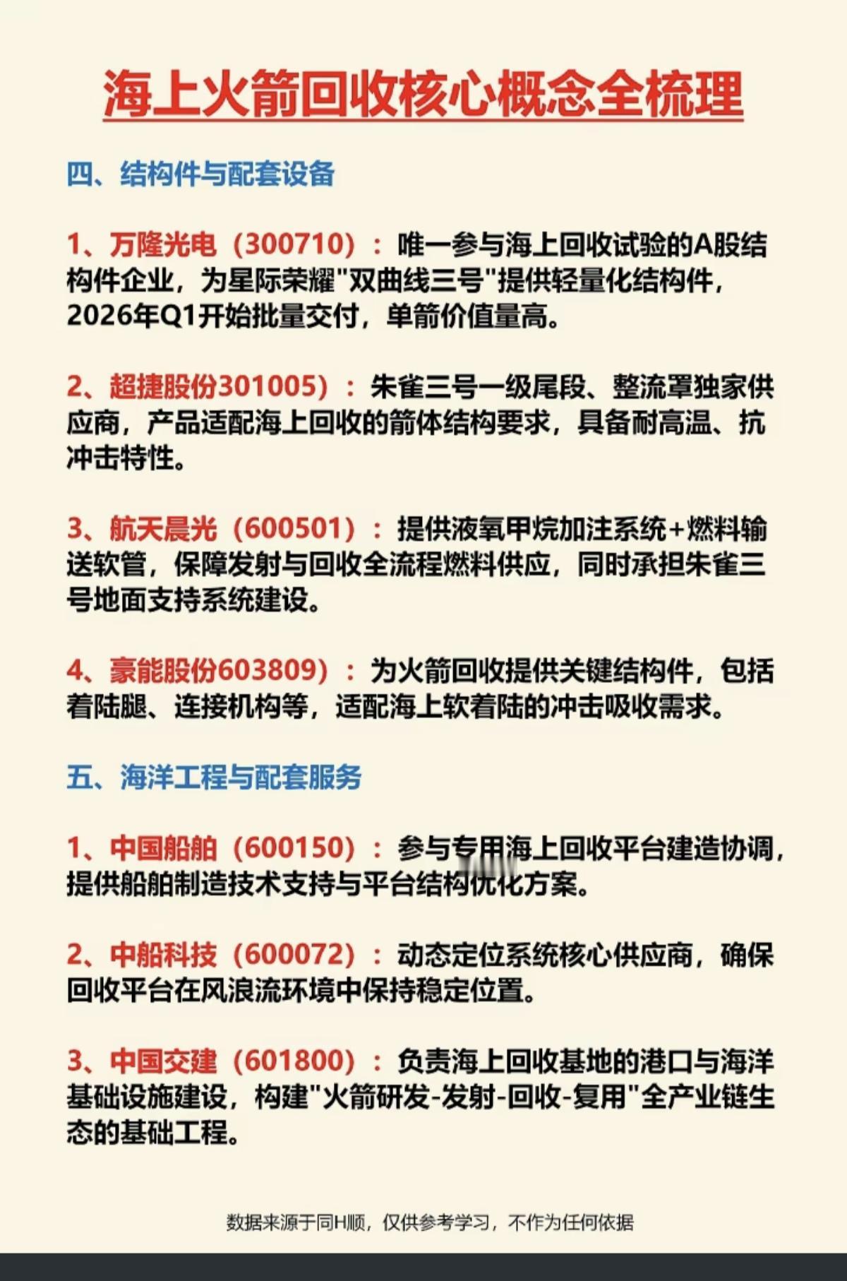 海上火箭回收:核心龙头股! 1.核心龙头,直接中标大项目 2.海上平台与测控系统 3.王系回收与材料 4.结构件与配套设备 5.海洋工程与配套服务