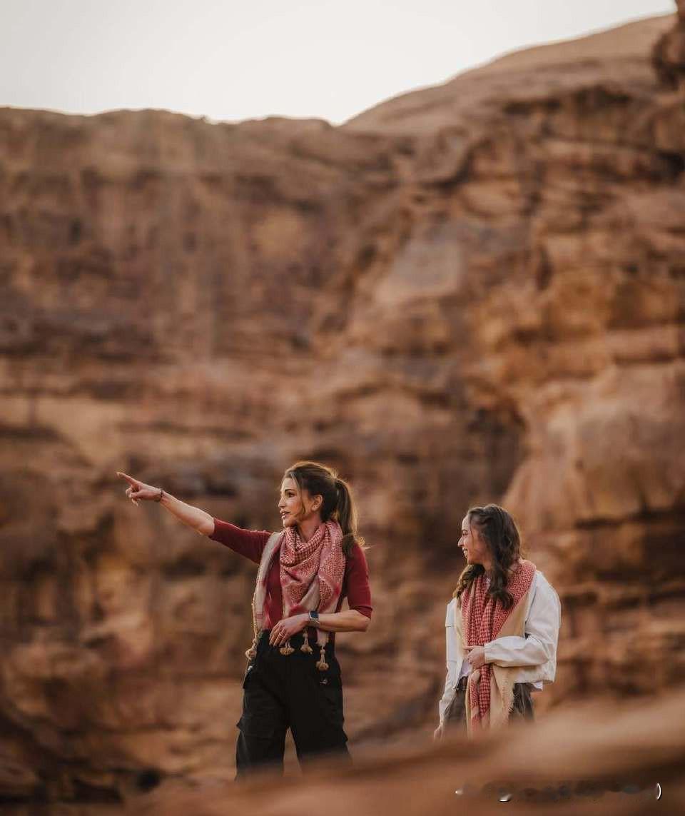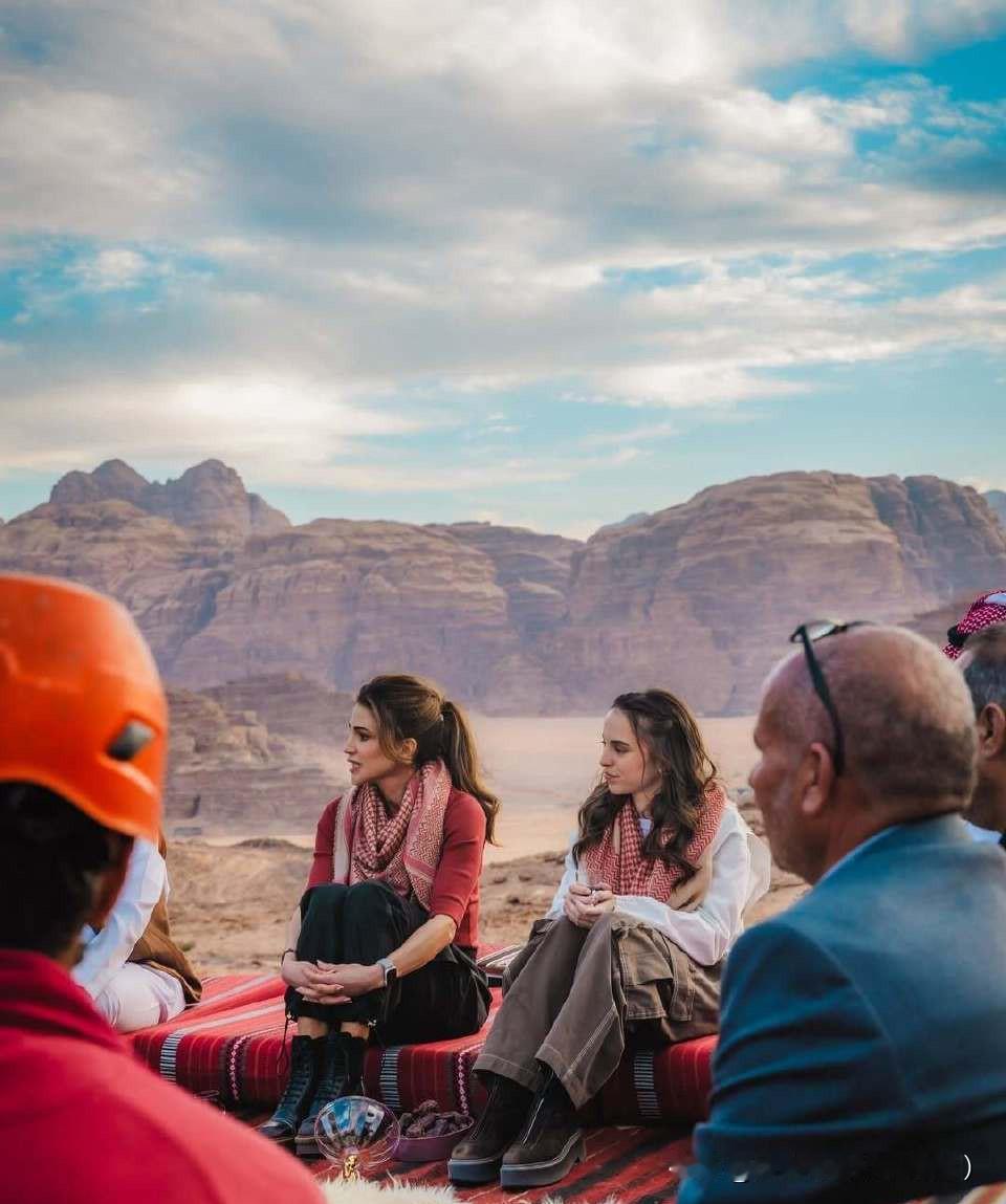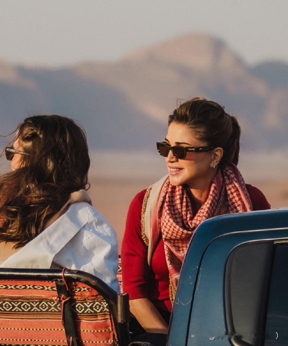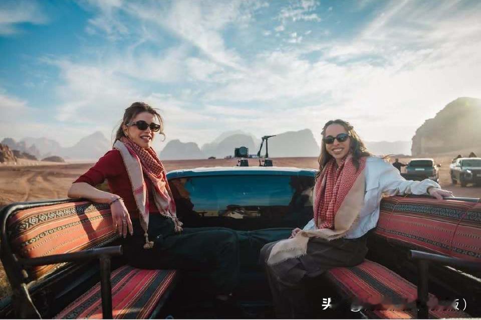 拉尼亚王后和女儿萨尔玛公主参观位于约旦的世界自然与文化混合遗产瓦迪拉姆!母女合体非常养眼,王后保养的也太好了,母女俩像极了姐妹花!
