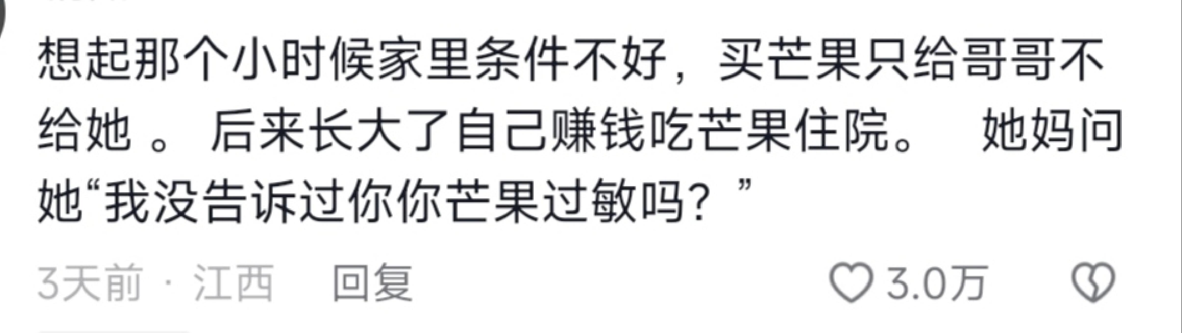 想起那个小时候家里条件不好,买芒果只给哥哥不给她。后来长大了自己赚钱吃芒果住院。 她妈问她"我没告诉过你你芒果过敏吗?"