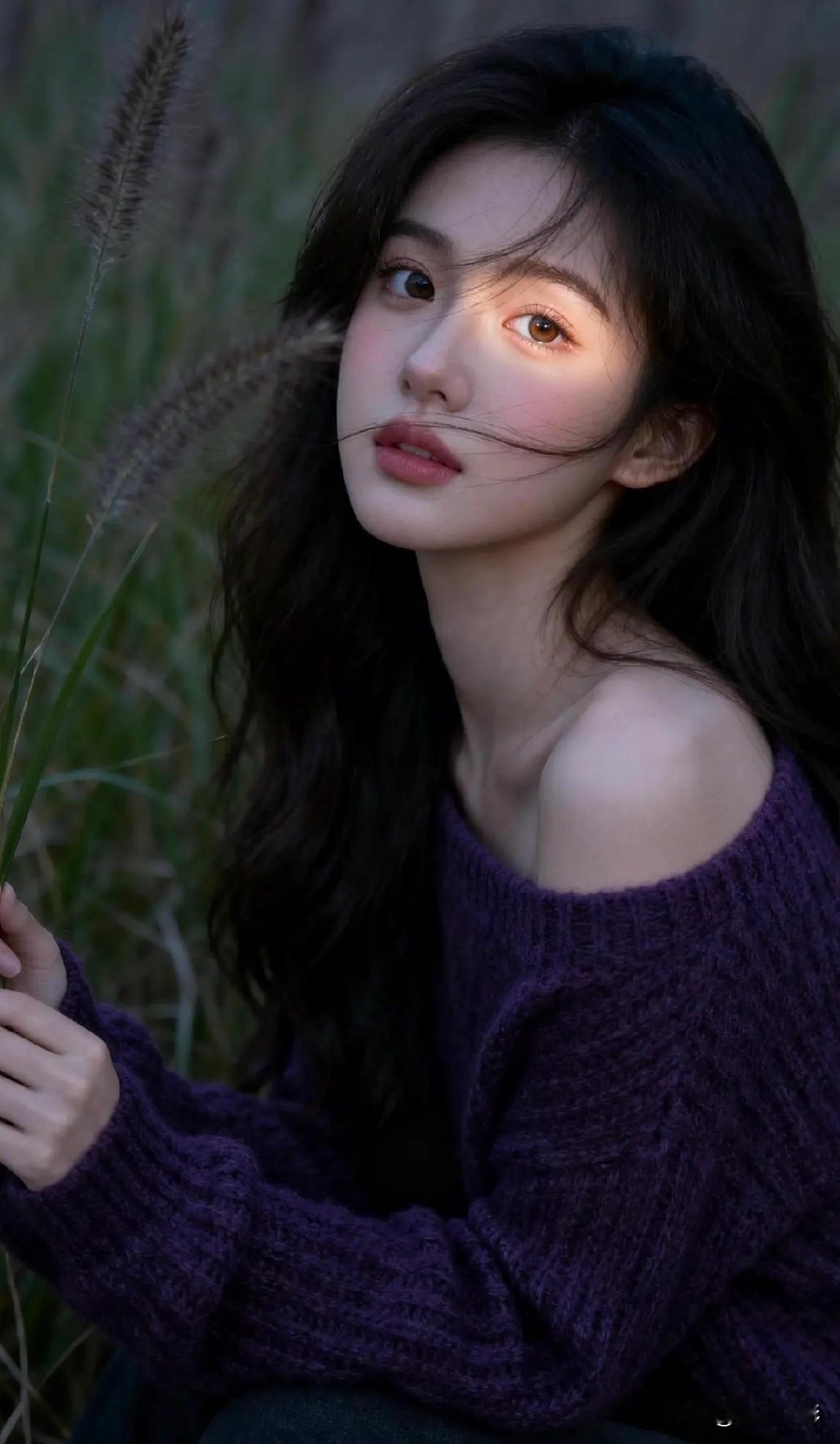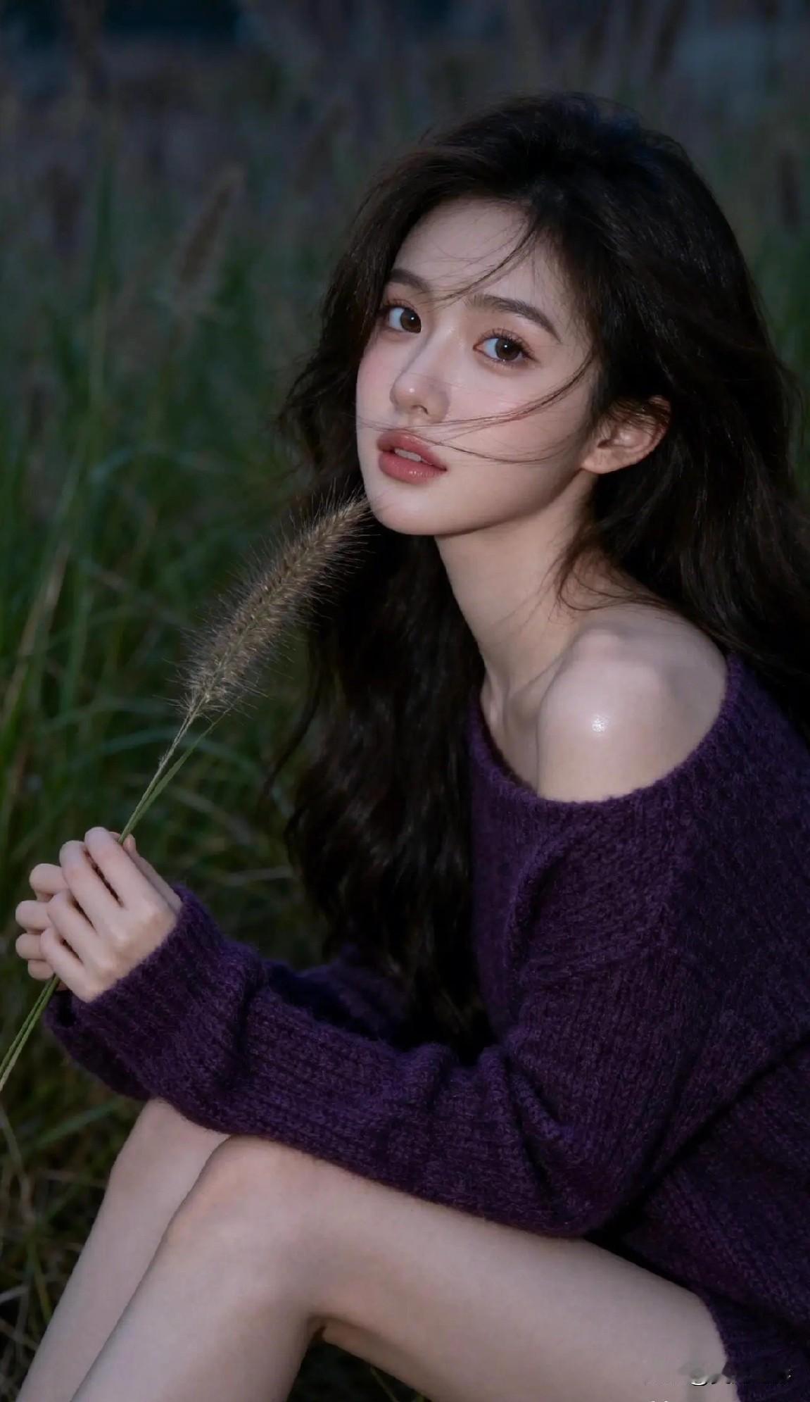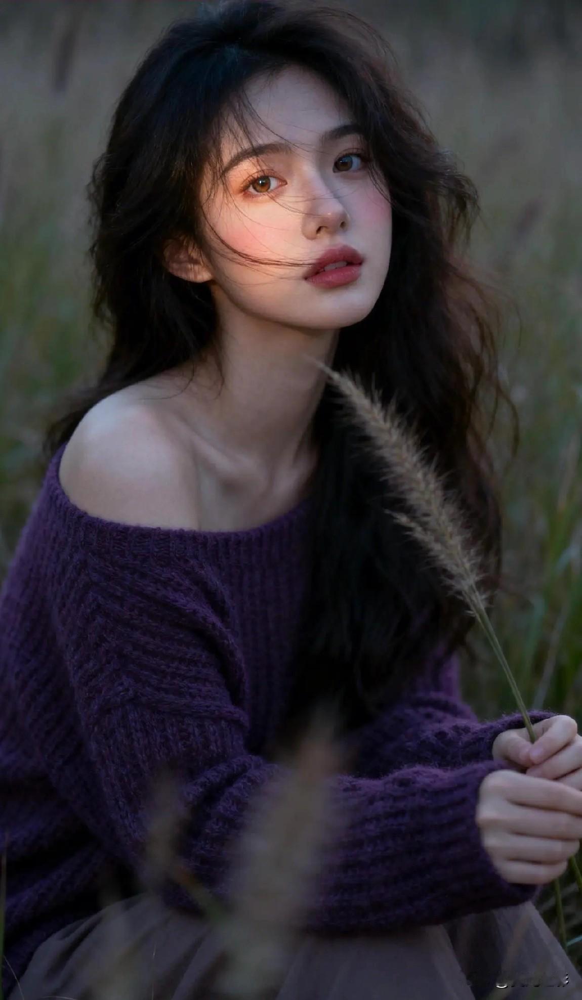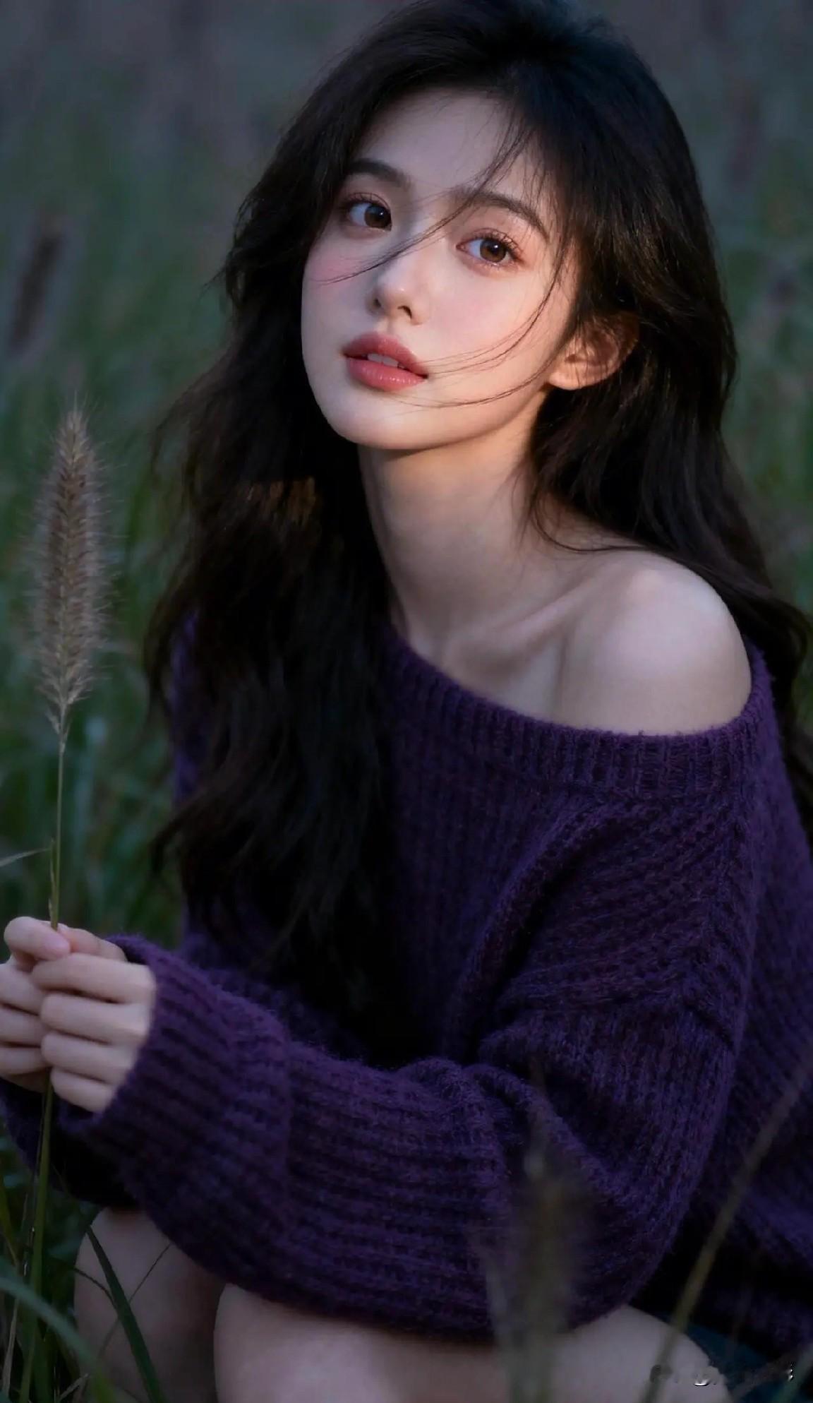 光之影 在草地上,手持野草,温柔地凝视镜头,紫色毛衣与自然融为一体。 淡淡的粉色毛衣 温柔毛衣照