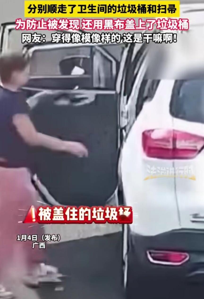 “人才!”广西,一对男女在停车场上厕所,没想到,两人上完厕所后,竟十分默契地顺走了公厕里的垃圾桶和扫把!女子率先将垃圾桶放到车上后,甚至还对男子做了个“催促”的手势,网友:穷到这个地步了? 在广西的一个普通停车场里,一场看似不起眼却极具荒诞感的“劫案”在光天化日之下上演了。监控探头记录下的这一幕,主角并非穷困潦倒的流浪汉,而是一对开着白色SUV、衣着光鲜的男女。这对怎么看都算得上是体面人的组合,在此次行程中没有选择带走当地的特产,也没有留恋风景,而是看中了公厕里那两个常年与污秽打交道的“宝贝”:一个垃圾桶,一把旧扫帚。 原本停在路边的这辆白色私家车,或许只是为了行个方便。按照常理,旅途中的司乘人员进入公厕,解决完生理需求后,洗手、甩干水珠、上车走人,这是一套标准的流程。但这两人显然有更独特的“如厕逻辑”。监控画面里,先走出公厕的是那名女子,她并没有空着手,而是大摇大摆地拎出了公厕里的垃圾桶。那并不是为了要把车内的垃圾倒进去,而是直接连桶带“味”地搬向了自己的车。 更有意思的细节在于两人之间的那种无声默契。女子将垃圾桶安置进车内后,转身对着公厕门口做了一个急促的挥手动作。那不是在驱赶蚊虫,而是在发出一道催促的指令。收到信号的男子随即现身,他显然领会了伴侣的意图,也没空手出来,手里紧紧攥着公厕配套的那把扫帚。没有任何犹豫,也没有左右环顾的羞愧,他淡定地将这把可能沾满了无数细菌的扫帚塞进了车后座。 这一系列行云流水的操作,让人不禁对“体面”二字产生了深深的怀疑。那是公共厕所里的清洁工具,每日经受着最肮脏环境的考验,味道自然不必多说,外观也早已陈旧。要把这种东西搬进那一尘不染的私家车里,不仅需要极强的心理素质,还得彻底屏蔽对卫生的基本认知。很难想象,当这对男女坐在弥漫着公厕余味的密闭车厢里,是否还能维持那份外表的光鲜? 有人推测,这两位是不是真的穷到了连一套清洁工具都买不起的地步?这种说法显然站不住脚,能开着SUV自驾游广西的人,经济实力再差也不至于在十几块钱的扫把垃圾桶上斤斤计较。这种行为更像是一种深植于骨髓的“占便宜”病态心理。在他们的逻辑里,摆在停车场的这些公用物资,既然没人时刻看守,那就是“野生的”,是无主的。不拿白不拿,拿了不仅省了钱,甚至可能还能从这种顺手牵羊的行为中获得一种难以言喻的窃喜感。 这种“配合默契”也引发了不少围观者的惊叹,只不过这种惊叹全是嘲讽。网友们送给他们“人才”的称号,甚至有人调侃真想知道他们的家庭住址,哪怕自费给他们寄一套崭新的,也别去祸害公厕里的那点可怜的家当。还有更狠的建议是,既然他们都不在乎面子,不如把这段视频发到他们的单位或者家族群里,让亲朋好友都瞻仰一下这对男女究竟有着怎样独特的“勤俭持家”之道。 这哪里是在省钱,分明是在透支人格的信用。那只旧垃圾桶和那把脏扫帚,加起来的价值可能都不够他们那辆车踩一脚油门的钱,但为了这点蝇头小利,他们丢掉的是做人最基本的底线。不知道当他们回到家,拿着这带着公厕味道的战利品打扫卫生时,会不会觉得为了这点东西,连脸面都不要了,这笔账算得太亏。