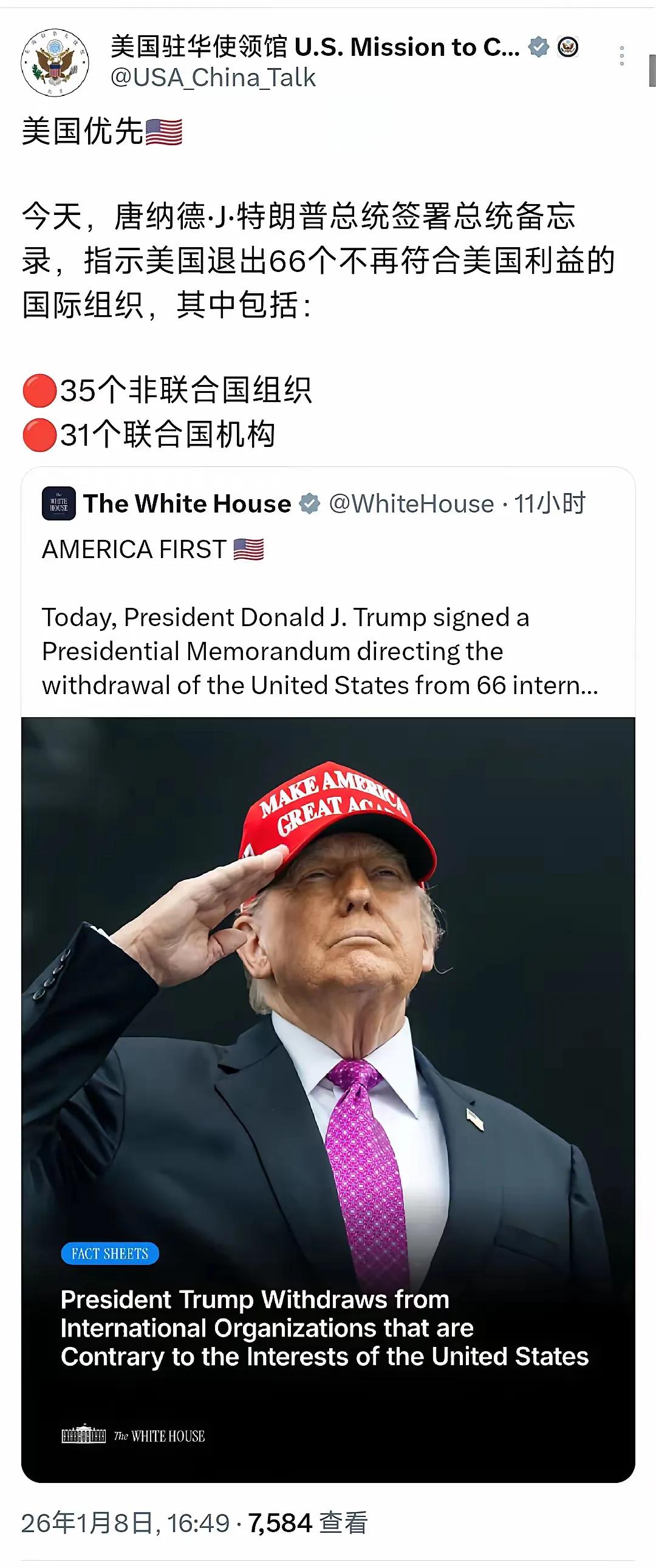 美国要掀桌子了! 1月8日,特朗普签了份备忘录,直接退出66个国际组织。35个非联合国机构,31个联合国下属单位,全在名单上。理由还是那句老调重弹:不符合美国利益。 这操作看着狠,其实挺短视。多少组织是美国自己牵头建的?为的就是在全球说话有分量,定规则有位置。现在说退就退,等于亲手砸自己家的招牌。 别看省了点会费,长远损失更大。气候、卫生、劳工这些事,哪件能闭门搞定?全球问题得靠合作,谁也别想独善其身。 更关键的是信誉。今天退出这个,明天甩开那个,盟友还敢跟你联手吗?国际社会也在变,多边机制正朝着更公平的方向走。美国一走,别人照样开会干事。 反而给咱这样的国家腾出空间。你不想当领头人,自然有人愿意站出来,推动共建共享的全球治理。世界不会停转,只会加速向前。 说到底,霸权思维早该翻篇了。合作共赢才是正道。谁跟不上这趋势,最后只能被时代甩在后面。