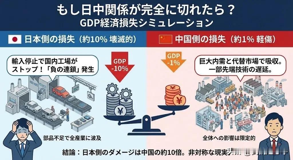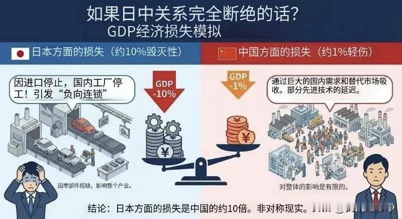 这是一张日本媒体做的图,咱们国内的网友给他翻译了过来。 大家可以看一看日本媒体是如何看待这场贸易制裁的。 标题就非常大胆,上面写道,如果中日关系完全断绝的话,那么gdp究竟会损失多少呢? 日本那边给出的判断是,日本大概会有10%的gdp全部消失。 而反观中国呢,只有1%而已。 这是日本媒体做出的一个判断。 大家可以看一看,感受一下他们那边的氛围。 现在他们还感受不到疼,因为时间还很短,他们的仓库里面还有一些库存,生产线还能开工。 别着急,慢慢往后看吧,那点库存的原材料总有用完的那一天。 后面就是停工停产,就会有很多人失业。 等到泡菜国大量的抢走了他们的市场,到那个时候脚盆鸡就知道疼了。 这就好像煲汤一样,咱们现在刚刚开火,别着急,让汤锅多炖一会儿。 火候必须要足,后面汤的味道才会鲜美。 鸡汤就得这么熬。