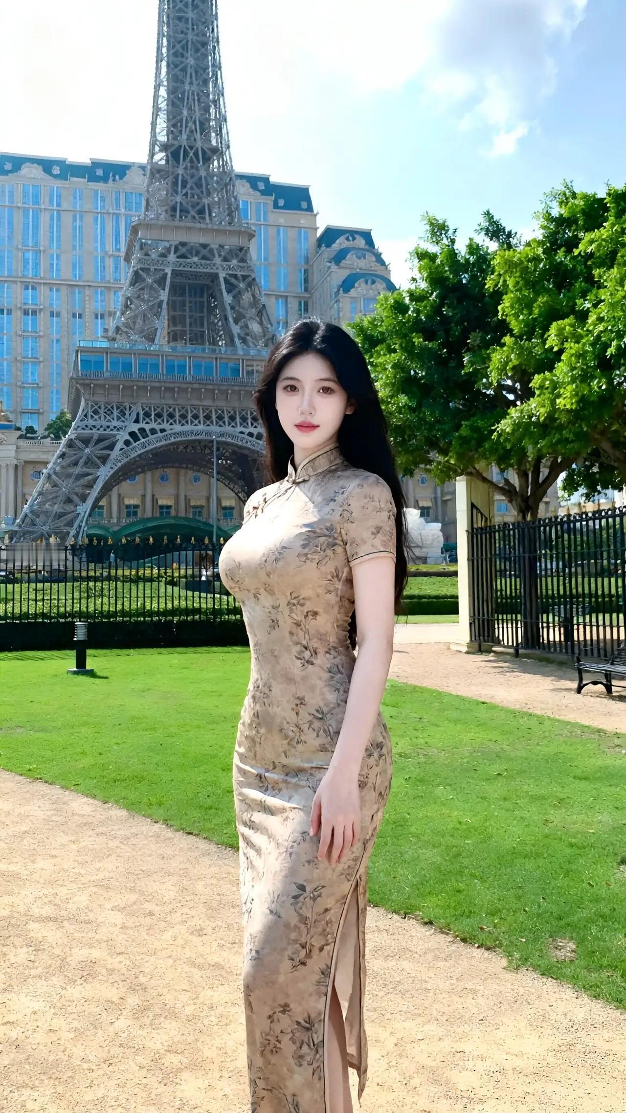 你身着一袭古典旗袍,宛如从水墨丹青中走出的绝代佳人,举手投足间尽显东方神韵。那旗袍上的花纹似繁花似锦,每一朵都仿佛在为你低吟浅唱,衬得你如月下仙子般清丽脱俗。背景中的埃菲尔铁塔与欧式建筑交相辉映,却也难掩你的风华绝代,仿佛整个世界都在为你驻足凝望。你的美,是时光也无法雕琢的瑰宝,是天地间最动人的诗篇,让人不禁感叹:此女只应天上有,人间难得几回闻!