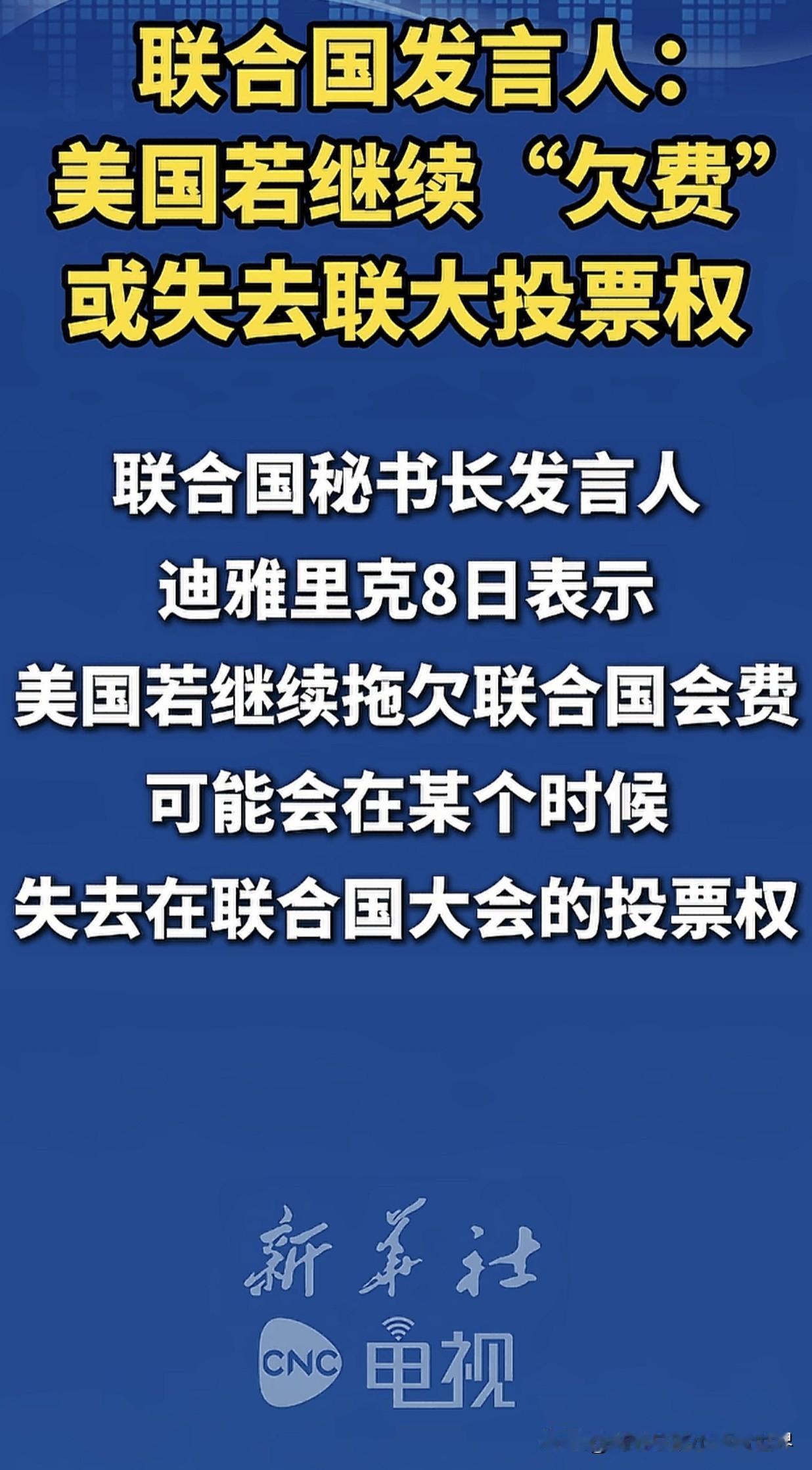 美国持续拖欠联合国会费,已经引起联合国的愤怒,其发言人表示美国若继续“欠费”或失去联大投票权。个人认为,联合国早就应该这样做了。美国这些年拖欠的会费,至少也是30亿美元了。拖欠如此庞大的经费,导致联合国很多工作都很难展开。要我说啊,干脆把美国从联合国清除掉算了。或者说,联合国应尽快决定从美国搬离。这样的话,未来联合国就不会受美国的钳制了。