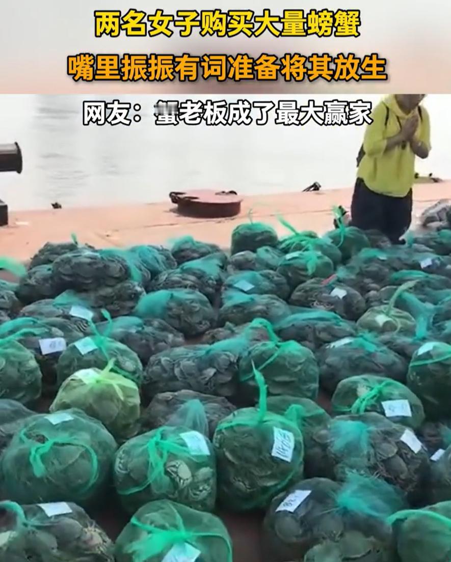 太夸张了!一男子到河边遛弯,突然看到两名女子在岸边搬运螃蟹,开始他还纳闷对方怎么跑这来卸货了,结果走近一看,两人这是来放生的,而这一地的螃蟹都是两人刚刚购买运过来的。网友:蟹老板成了最大赢家 视频中,两名女子双手合十,对着满地的打包好的螃蟹振振有词的念叨,虽然没注意听他们说的是什么,但要做什么却一清二楚,其中一名女子的手上手套都来不及摘 那一地螃蟹,看起来是从市场上成箱买来的,有些在塑料筐里叠着,几乎不动。河边风不小,两人倒很虔诚,可这一幕却让人心里犯嘀咕:这些蟹,真能活吗? 对此, 有网友说:这一大笔钱,去救助农村的贫困儿童不是更有意义 还有网友说:现在季节放螃蟹,成活率挺低,如果是蟹塘现抓现放,还要好一点,在市场购买,有可能存放几天剩货,大量螃蟹挤压缺氧,再放生,无法想象 其实类似的放生场景,这些年我们看过不少。鱼、龟、鸟,现在连螃蟹也成箱地往水里倒。那份动机或许不假,但做法却常常让人捏把汗 一来,市场买来的水产未必适应野外环境;二来,大规模投放还可能破坏本地生态。更不用说,很多动物在运输和存放过程中已经奄奄一息,放下去也不过是换个地方结束生命 还有一点很容易被忽略,市场行为本身会被这种需求反向刺激。你今天买来放,明天就会有人专门为放生去抓、去卖,表面看是救,实际可能变成另一种循环。生命在中间被反复搬运、反复消耗,结果并不体面