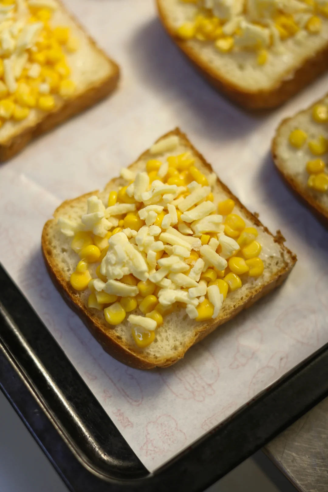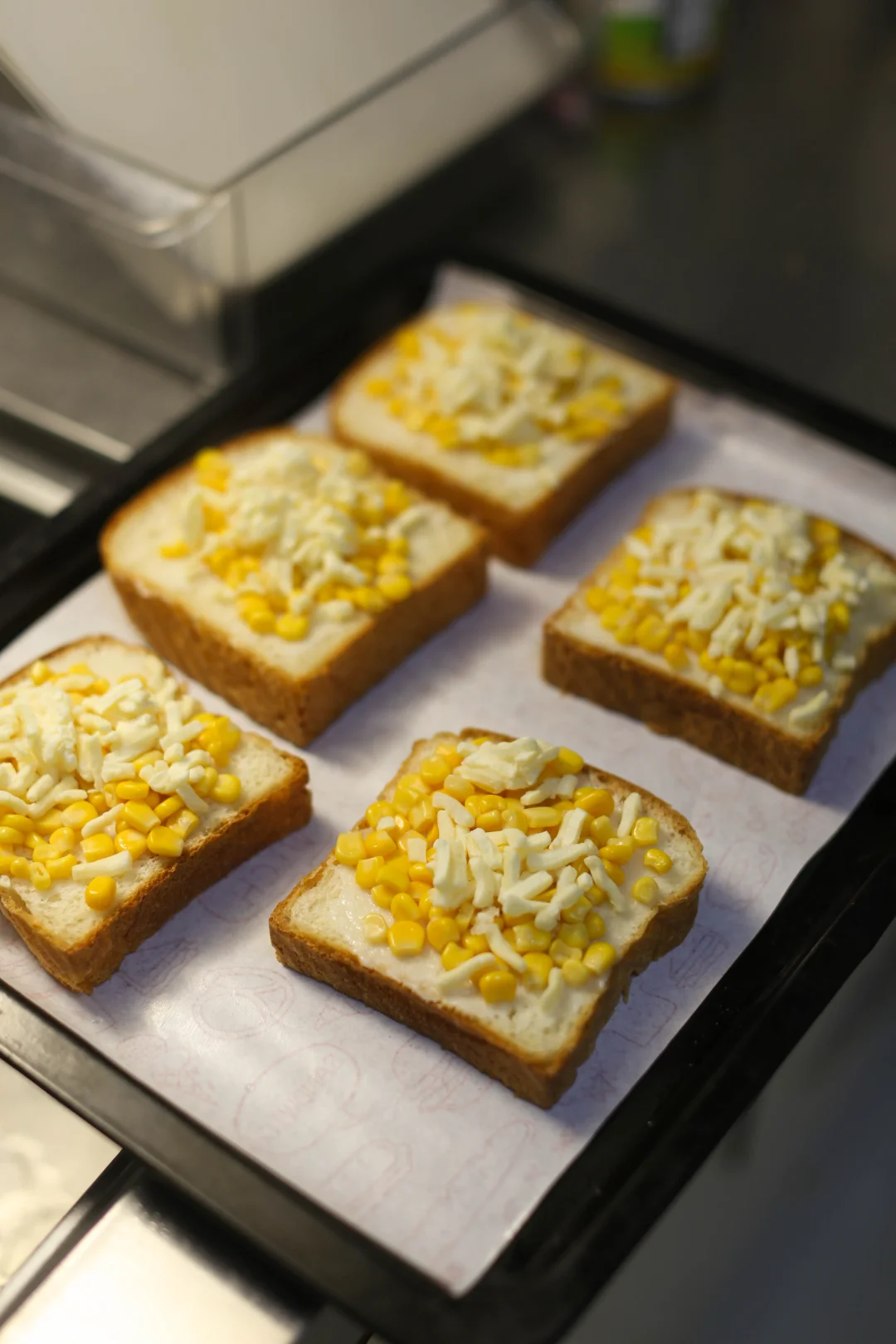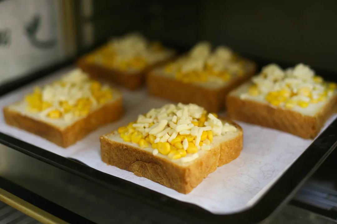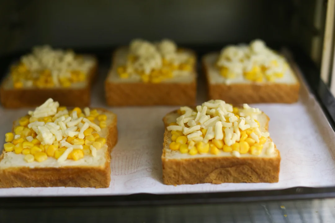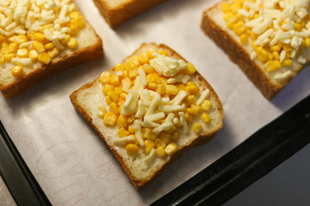 将混合好的玉米芝士馅料均匀铺在烤好的吐司片上,尽量覆盖整个表面。