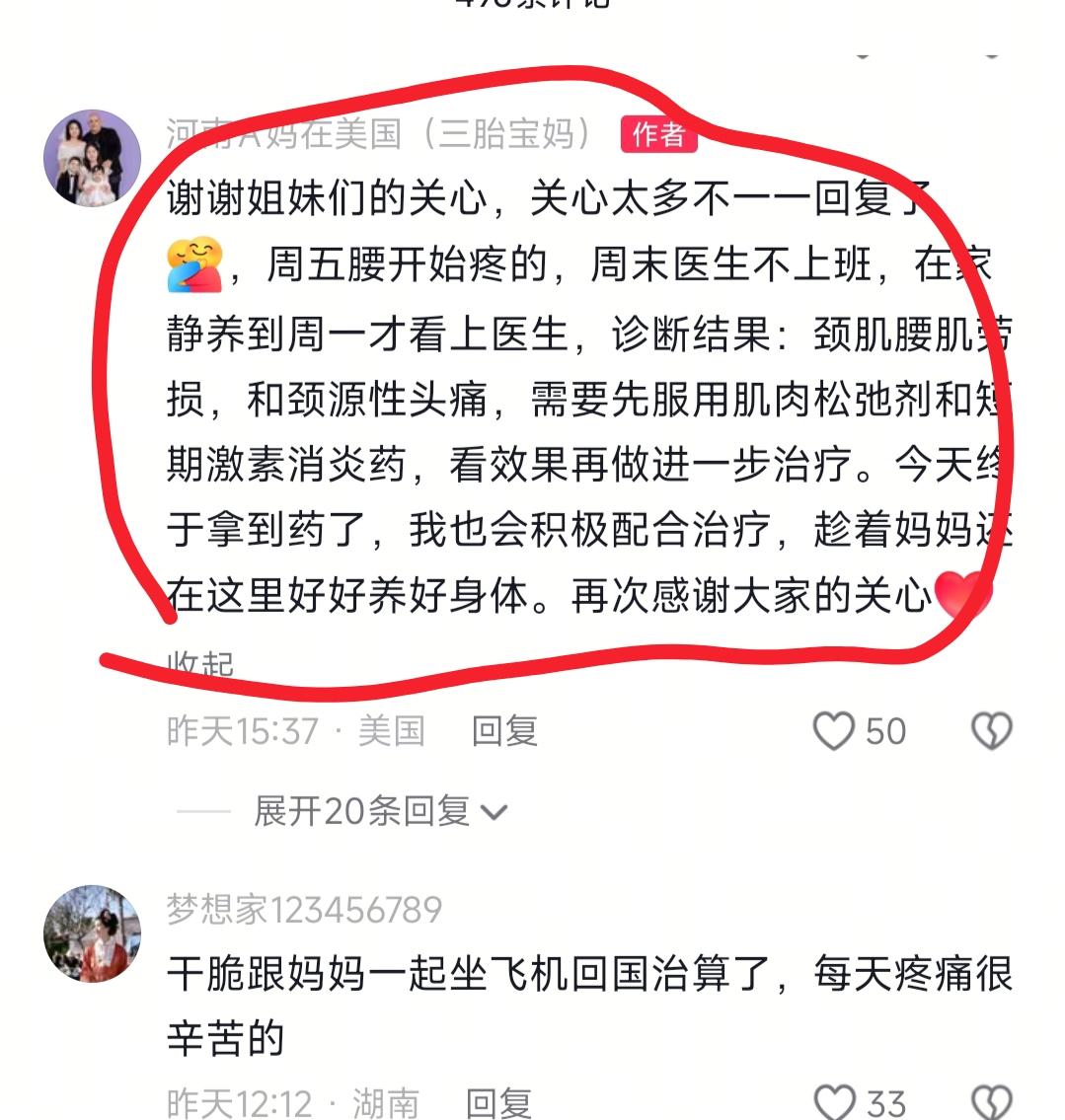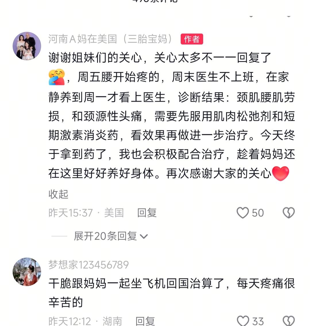 现在全网最糟心的女人就是河南a妈在美国了吧! 不是因为要照顾三娃也不是因为跟老公有矛盾而是因为为了照顾三个娃,导致腰椎劳损,非常疼,去看医生,却折腾得崩溃 说实话,谁带三个娃谁知道有多酸爽!河南A妈在美国每天跟打仗似的,清晨爬起来做早餐,喊娃穿衣洗漱,送完大的带小的逛超市,下午接娃辅导作业,晚上哄睡再收拾家务,忙到深夜才能沾床。本来想趁娃午睡偷个懒躺一会儿,结果发现小的那个扒着床头喊妈妈,根本没机会。某天腰突然疼得直不起来,她扶着墙站着,心里嘀咕可能是腰肌劳损,又怕肾有问题,郁闷得想叹气。别人说人这辈子就是渡劫,带娃就是渡大劫,以前觉得胡扯,现在是真信了。 她硬撑着在家静养两天,想着可能歇歇就好,结果疼得更厉害,只能决定去医院。打开手机查医院,打电话预约,那头直接说最快周一才能看,我晕,这效率简直了!等到周一,她安顿好三个娃,独自往医院冲。到了先挂号,然后坐在候诊区等,等得都快睡着了才被叫号。医生问完症状,说可能是肾的问题,得先尿检。她拿着单子去检验科,工作人员甩下一句六点取结果,然后就没影了。本来想带娃和老妈出去逛逛,一家子憋家里好几天了,结果这腰疼得挪不动步,只能作罢,心里别提多憋屈了。 熬到下午六点,她准时冲去医院拿结果,屁颠屁颠跑回诊室,好家伙,医生早下班了!她站在空荡荡的诊室门口,差点崩溃,这叫什么事儿啊!第二天又跑一趟,医生看了结果说有点感染但问题不大,最终诊断是颈肌腰肌劳损加颈源性头痛,开了肌肉松弛剂和消炎药。她拿着药方去取药,心里疯狂想念国内,以前在老家腰疼,去医院当天就能看,当天拿药,哪用这么折腾?评论区有网友说让她回国治,还有人分享用吹风机热风加红花油敷腰,她抱着试试的心态试了下,哎,还真有点用,简直太给力了! 她在网上分享完经历,感谢姐妹们的关心,说周五开始腰疼,周末医生不上班,熬到周一才看上病。评论区直接炸锅,有人劝她跟老妈一起回国治,有人心疼她带娃太苦,还有人问她那边有没有agency care。本来以为就是吐个槽,没想到收到这么多暖心建议,她突然觉得这折腾也算没白受。 总之,说真的,姐妹们带娃千万别硬扛,腰疼了赶紧歇,别等疼到走不了路才去看医生。实在没时间去医院,试试吹风机热敷加红花油,比硬撑着强多了。你说是不是这个理儿?带妈妈逛美国 美国婆媳关系 河南A妈
