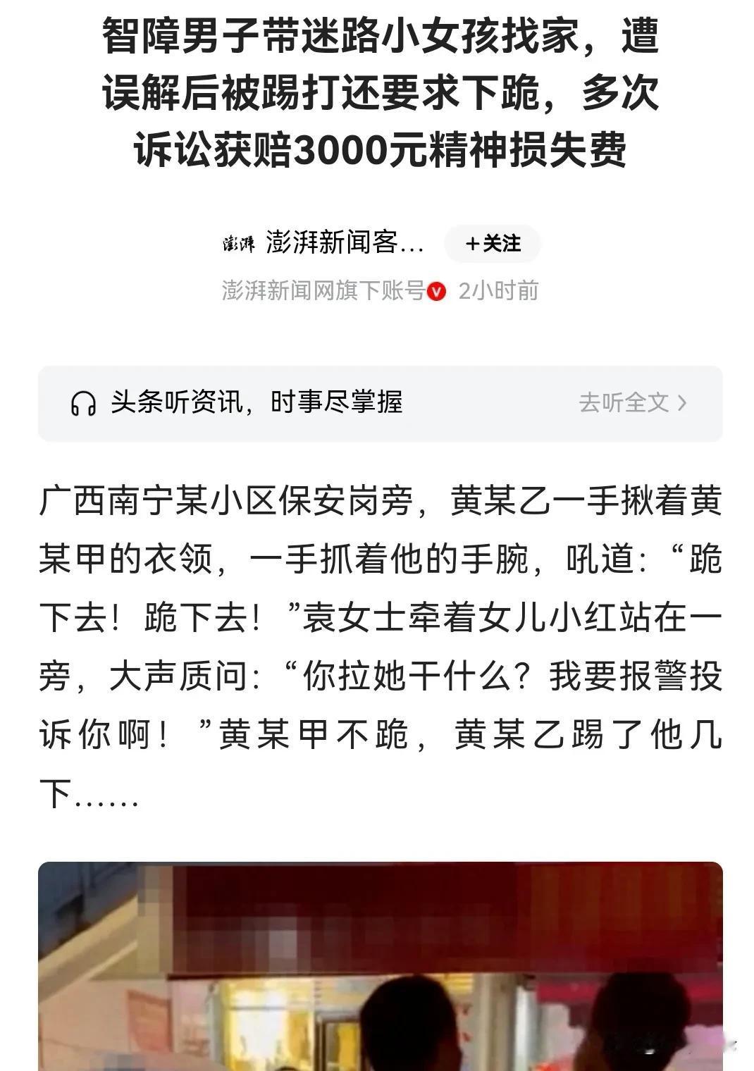 广西南宁,三级智障男子和女儿回家,遇到一个9岁的迷路女孩,男子便带女孩找家人,他们来到住处1楼,女孩的母亲看见了,却大声说道要报警,路过的人看见了,更是一手抓着衣领,一手抓着手腕,让他跪下去,男子不跪,女孩的父亲就踢打他的腿。 真的是太气愤了,黄先生的儿女都替父亲感到很憋屈,父亲明明是做了好事,是送9岁迷路的女孩回家,结果却被女孩的母亲报警,被路过的人打了,还众目睽睽之下,逼他下跪。 这件事情实在让他们一家人难以接受,女孩的母亲就是欺负他们的父亲是智障,所以才不分青红皂白地怀疑他。 事情到底是怎样的,为何黄先生做了好事还要被打,被逼下跪? 当天,黄先生和女儿回家,当时黄先生的女儿小莉看到了小红,看到她一个人慌慌张张的,就有些奇怪。 但是小莉也没有想这么多,就和父亲进了楼梯,当时小红也跟着进去了。 小红家是住在3楼,黄先生家住在11楼,但是小红却跟着黄先生父女俩进上了11楼。 当时黄先生只按了11楼的按钮,他们要出去,小红却没有出去,他就意识到小红可能是迷路了。 于是他就问小红家住在哪里,但是小红没有回答。 小莉马上意识到小红是迷路了,她很担心小红,就让父亲把小红送回家。 女儿这么一说,黄先生担心小红的父母担忧孩子,就带着小红找家人。 他们一层楼接一层楼地找,可是找了好几层楼都没有找到小红家在哪里。 后来黄先生意识到,或许小红的家人会在1楼等小红,于是他又把小红带回1楼。 此时着急寻找孩子的袁女士,已经在小圈里找了一圈,正好回到单元入口的方向。 她远远的就看到了黄先生和她的女儿在一起,还看到黄先生拉着她女儿的手。 难道女儿就是这个男的带走的,为人母的袁女士,一想到这个问题,就非常气愤,她就大步流星地跑了过去。 她来到黄先生跟前,大声地质问道:“你为什么要拉我女儿?你想干什么?我要报警抓你。” 黄先生愣了一下,三级智力残疾的他,看着面前凶凶的女士,莫名的就感到很害怕。 又在此时,在街对面,一个路人也正好注意到了这里有情况,他就赶紧跑了过来。 他过来一看,经小红母亲一描述,他也非常气愤,他用手指着黄先生。 黄先生一看又来了一个凶凶的男的,他不知道自己做错了什么,害怕得一直后退。 他没有作出解释,一味地逃跑,遇到这种事,有智障的黄先生,并不知道该怎么处理,只好不停地后退。 小红的母亲一看,更加断定黄先生对着小红做了坏事,路过的人很气愤,就一只手抓着黄先生的衣领,一只手抓着黄先生的手腕,不停地喊着:“你给我跪下去,跪下去。” 黄先生没有做错事情,他当然不愿意跪,结果路过的人就踹他的小腿关节,并且还用膝盖顶他的腿。 后来小区的保安看到黄先生确实有智力障碍,就劝阻他们,黄先生这才没有继续被打。 事情发生之后,黄先生被送往了医院,结果诊断为两膝关节组织受伤。 发生这样的事,黄先生和家人自然是很气愤的,黄先生虽然是三级智力障碍,但他也是一个生活自理的人,甚至还当过保安,也卖过东西,修过自行车。 事后他也反应过来,他不过是做好事,却被打,他只不过没有反应过来作出解释,他们就不分青红皂白地去逼他下跪,他真的气不过。 家人也很气愤,特别是小莉,也后悔让父亲做这件事情,如果不让父亲送小红回家,父亲就不会被打,也不会在众目睽睽之下,被逼下跪。 发生这样的事,黄先生自然要追究小红母亲和路人的责任,他们提起了行政诉讼。 但是,由于袁女士和路人都是担忧小红,担心小红是被黄先生拉走的,所以在这种情况下,路人才会打黄先生,因为黄先生没有及时做出解释,只是在逃跑,这才想着要控制他,逼他下跪。 在这种情况下,民警认为,他们只是在保护小红,并非有意要故意伤害黄先生,因此给作出《不予行政处罚决定书》。 黄先生和家人自然不同意这个结果,既然行政处罚认为小红路人的行为不构成违法,他们只好提起民事诉讼。 黄先生认为,自己做了好事,小红的母亲和路人却让他在众目睽睽之下下跪,给他的精神造成了损害,他要求精神赔偿。 《民法典》第1183条规定: 侵害自然人人身权益造成严重精神损害的,被侵权人有权请求精神损害赔偿。 法院经过审理认为,黄先生是助人为乐,小红的母亲没有经过核实事实,路人对黄先生进行踢打,并且要求下跪,这已经对黄先生的身体和人格造成的损害,因此他们存在过错。 《民法典》第1165条规定:行为人因过错侵害他人民事权益造成损害的,应当承担侵权责任。 由于这件事已经对黄先生造成了精神损害,因此法院判决,小红的母亲和路人需要赔偿3000元,并且进行公开道歉,承担医疗费用。 那么你对黄先生的事情有何看法呢?