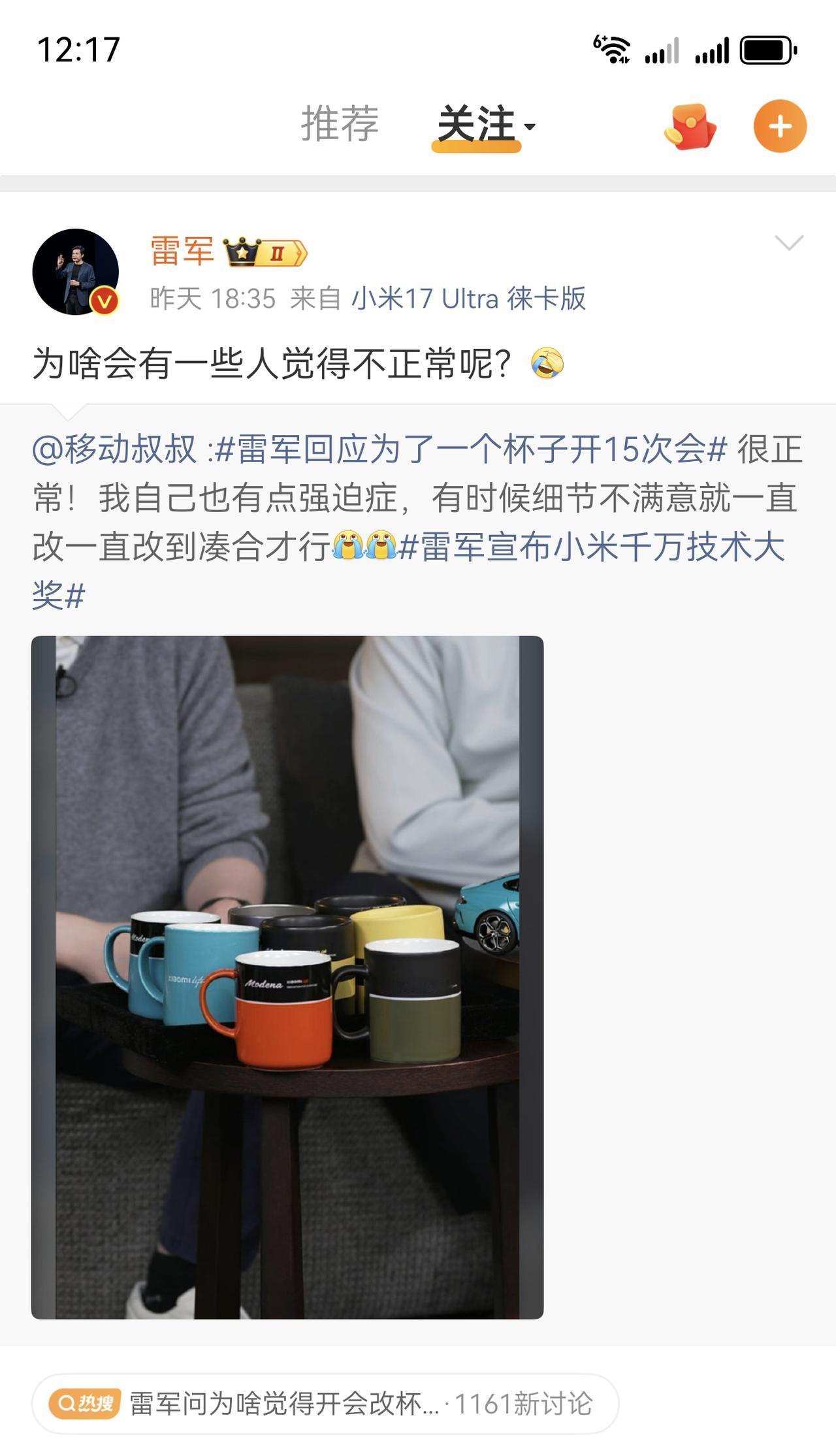 一个水杯开了15次会议,正常么? 如果一个项目经理来说是正常的, 但对一个万亿市值老总,有待商榷! 按照产品复杂程度和流程, 小米汽车,玄戒芯片,小米手机,电器! 雷总一年不得开上千万次会议啊? 毕竟小米产品那么多[捂脸]