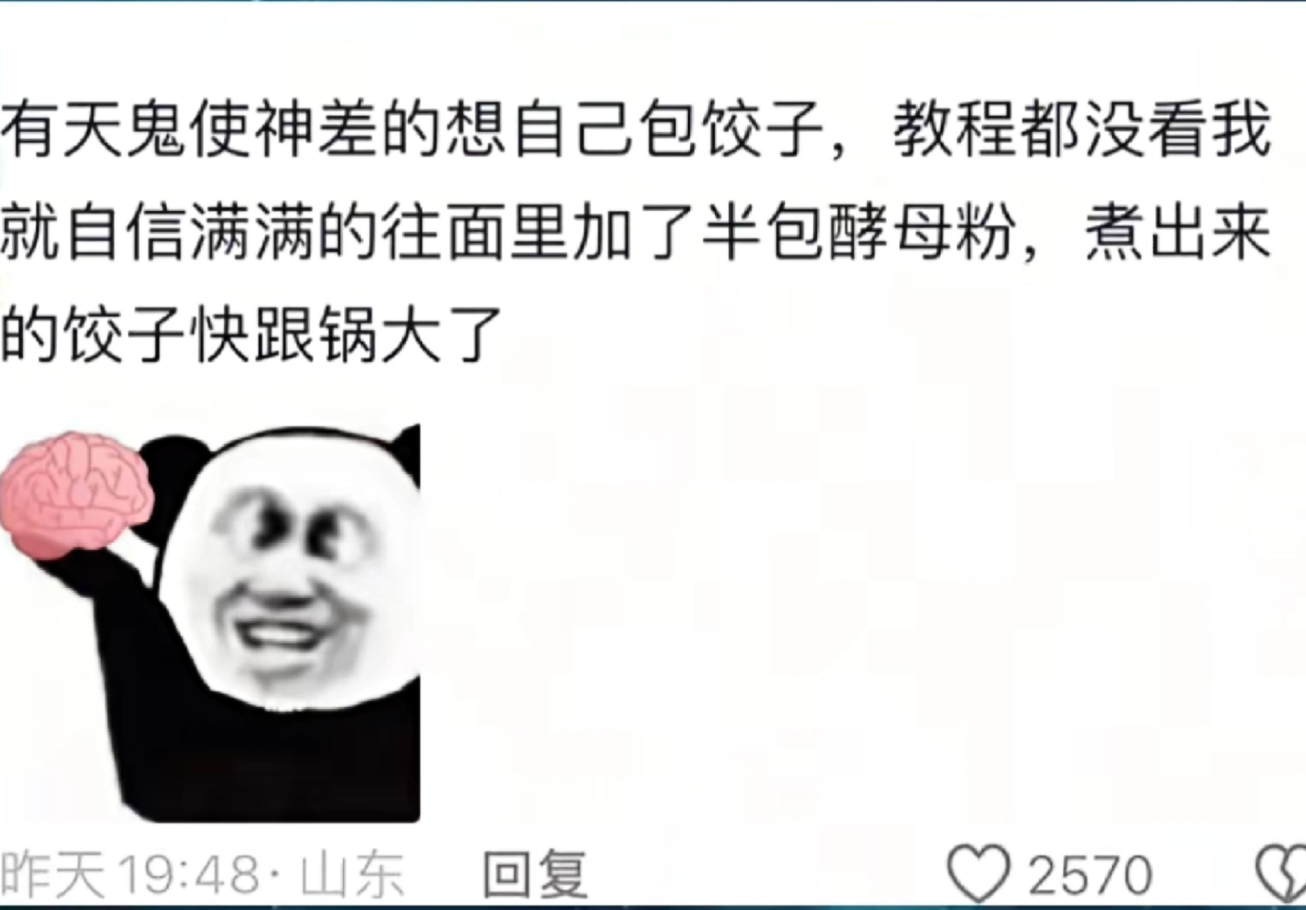 有天鬼使神差的想自己包饺子,教程都没看我就自信满满的往面里加了半包酵母粉,煮出来的饺子快跟锅大了