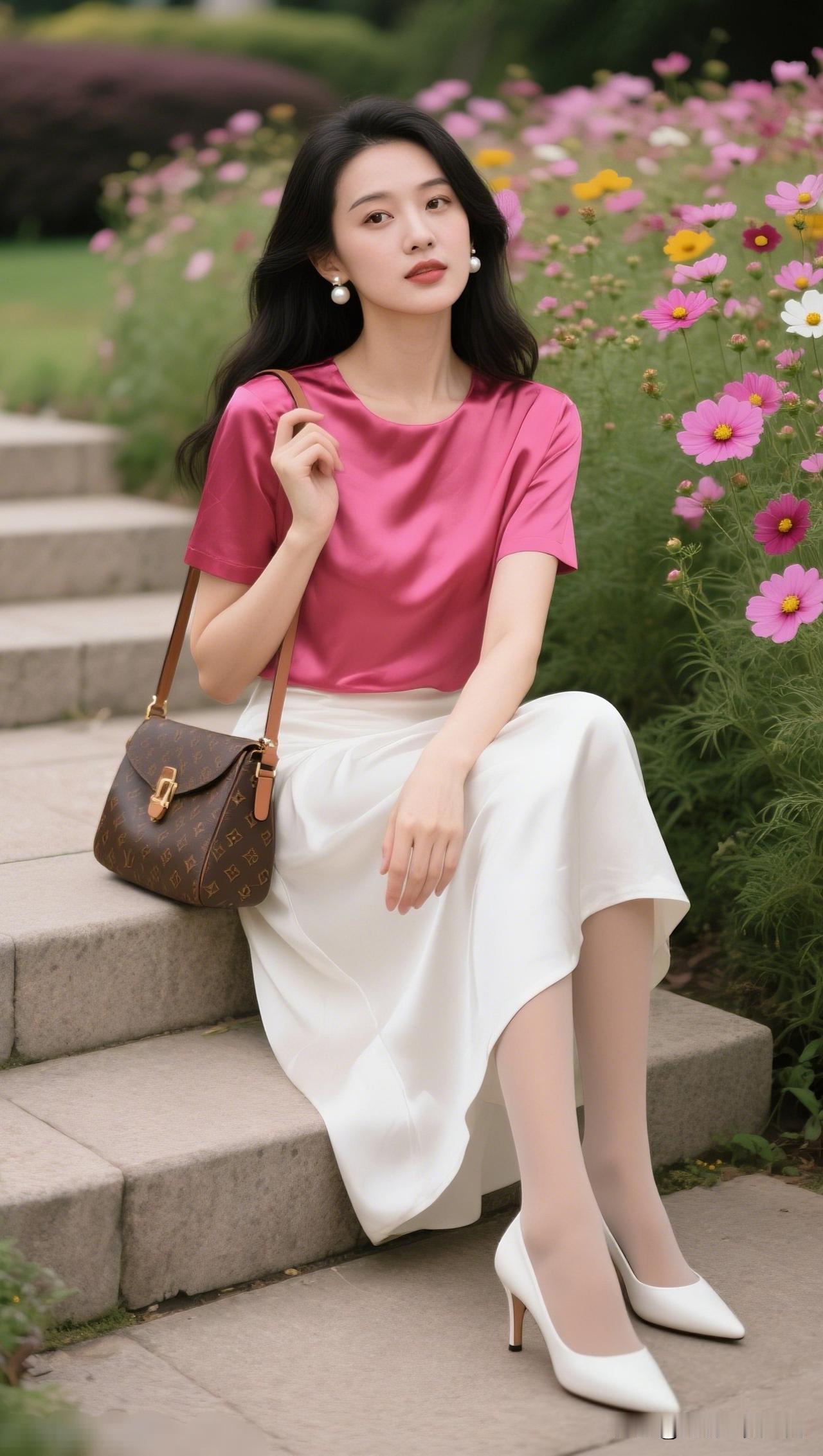 粉衣美人倚花坐,春光满面笑语多。什么颜色裙子好看 优雅粉色上衣搭配白色长裙,坐在花丛中的石阶上,尽显清新自然之美。